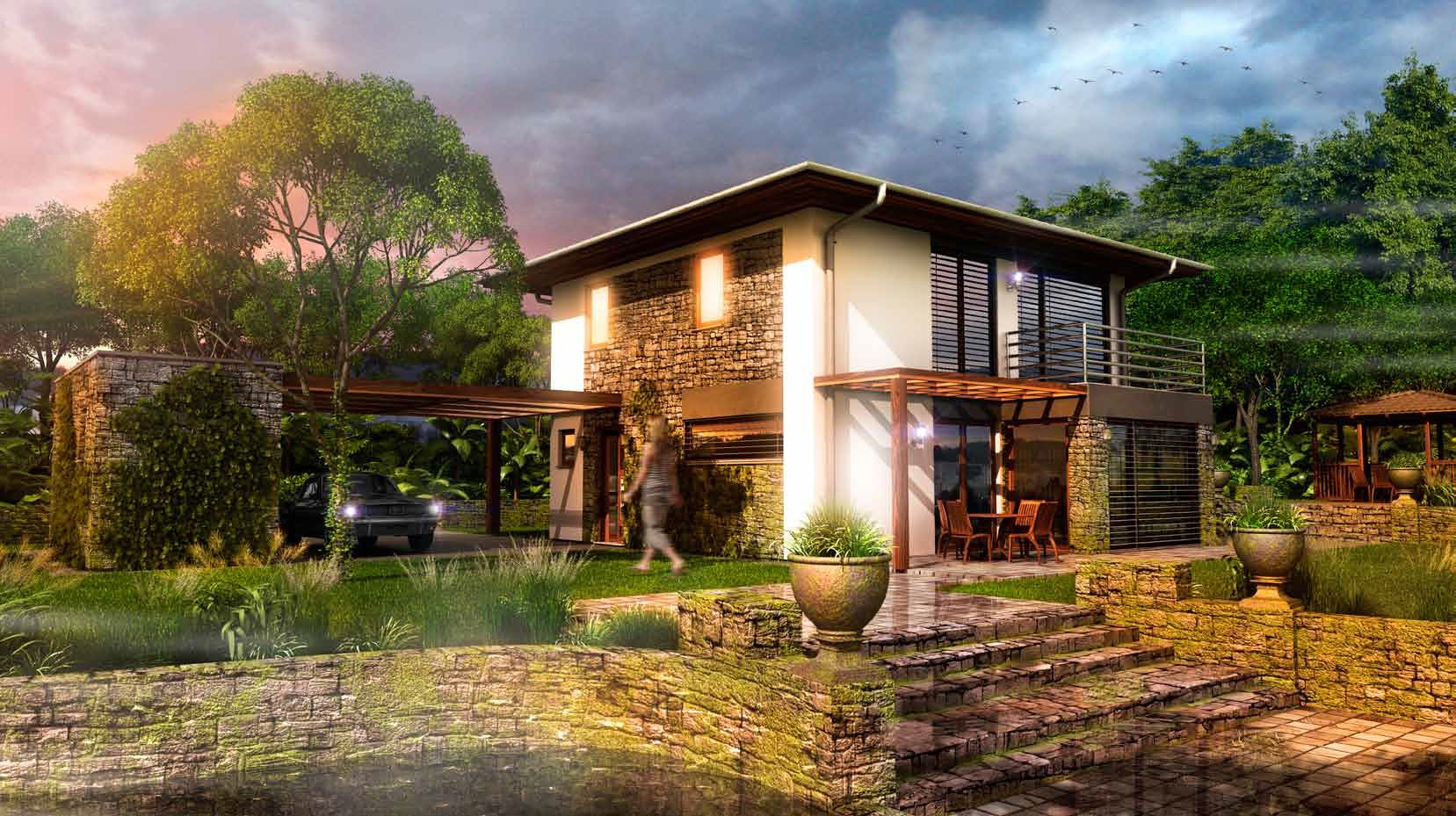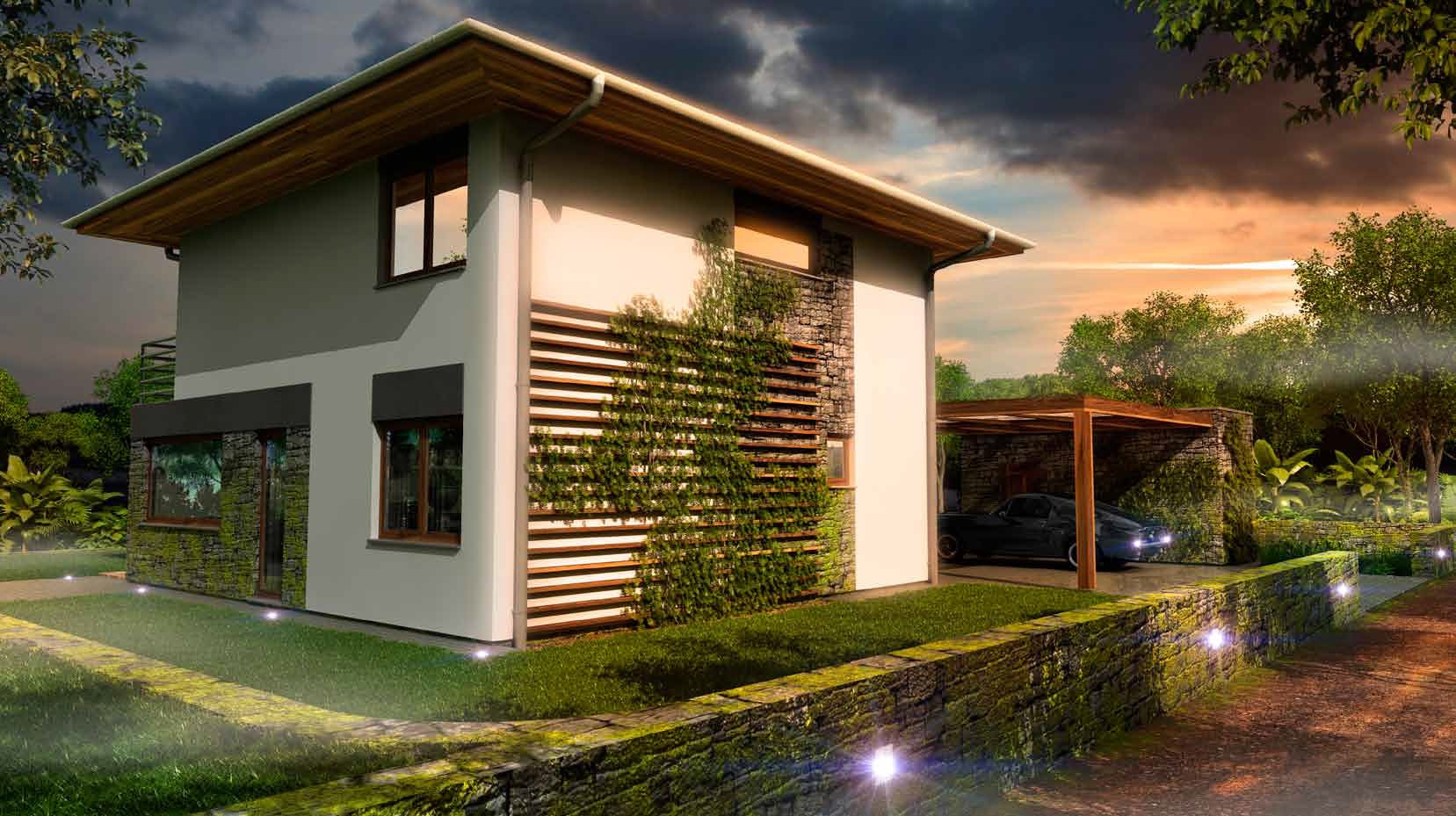 Moderní kompaktní architektura s pultovou střechou bude výrazná v městské i venkovské zástavbě, kde dům vynikne svou výškou. Postačí mu malý pozemek. Na velmi malé zastavěné ploše nabízí praktické a úsporné bydlení pro čtyřčlennou rodinu, pokoje v patře nejsou zmenšeny šikmými stropy jako v běžné podkroví. Ke schodišti je třeba projít přes celý obývací pokoj.