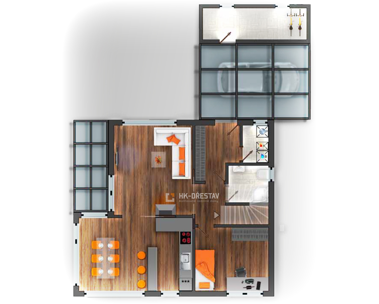 Na velmi malé zastavěné ploše dům poskytuje komfortní bydlení pro až pětičlennou rodinu, včetně kryté terasy a parkovacího stání s mal... m skladem. Interiér je bohatě prosvětlený, velmi praktická je možnost oddělit kuchyň a obývací pokoj. V patře je k dispozici velká šatna.