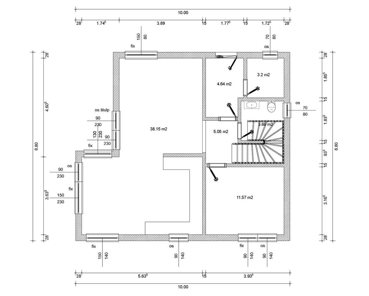 Jednoduchý dům vhodný na venkov i do města, postačí malý pozemek. Poskytne praktické bydlení s nízkými provozními náklady. Má přehlednou dispozici, příjemný obývací pokoj a komfortní technickou místnost. Pro pětičlennou rodinu je výhodné rozdělení na ložnici rodičů v přízemí a dětské pokoje v podkroví, bylo by potřeba více úložného prostoru