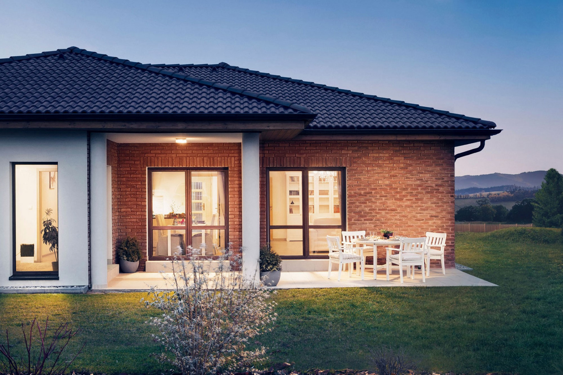 Jedna z mnoha verzí oblíbeného domu na půdorysu písmene L s valbovou střechou a rohovou terasou – bungalov pro čtyřčlennou rodinu. Nabízí účelnou bezbariérovou dispozici, přehledně rozdělenou na denní a ložnicovou zónu. Nejatraktivnější částí domu je velký společný obývací prostor s atypicky řešenou kuchyní. K výhodám domu patří i integrovaná garáž.