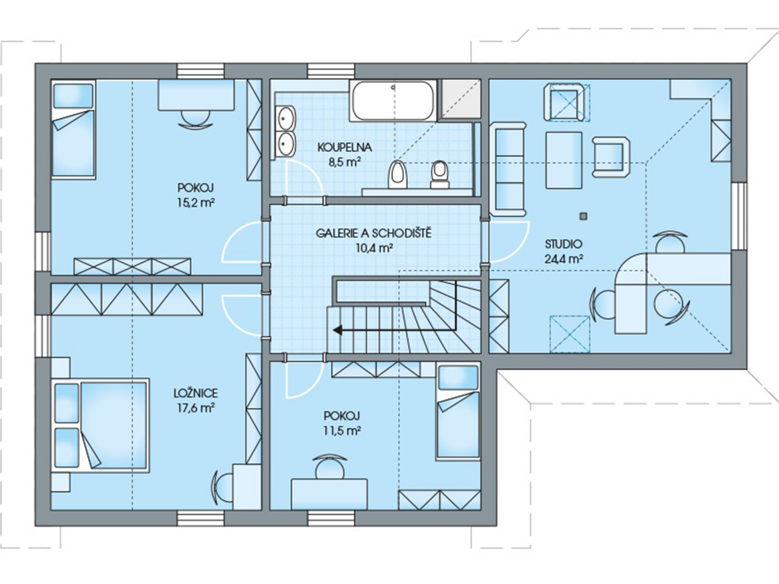 Jedna z mnoha verzí oblíbeného domu na půdorysu písmene L s valbovou střechou a krytou terasou, tentokrát v moderním designu s francouzskými a střešními okny. Zaujme atypicky řešeným společným obývacím prostorem se zkosenou stěnou a částečně oddělenou jídelnou a kuchyní. Nechybí pracovna a oblíbená krytá terasa. V podkroví jsou velké pokoje pro rodiče a 2 děti s pohodlnou koupelnou a velkými úložnými prostory.