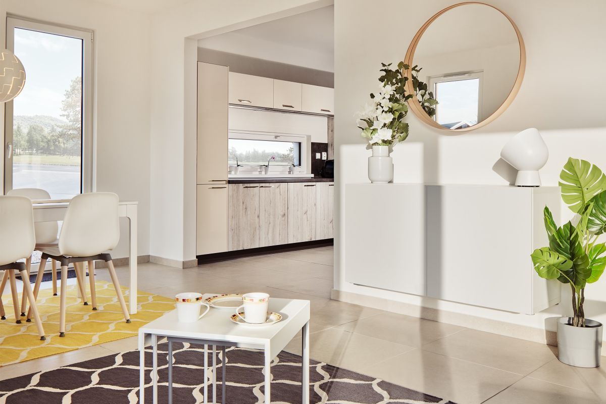Stavba inspirovaná tradičním typem domu se sedlovou střechou se bude nejlépe hodit na venkov nebo do malého města. Je určena pro čtyř až pětičlennou rodinu a vybavena odpovídajícím zázemím. Nejhezčí částí domu je atypicky členěný společný obývací prostor, v podkroví jsou nadstandardně velké dětské pokoje. Výhodou je i přistavěná garáž s využitelnou půdou.