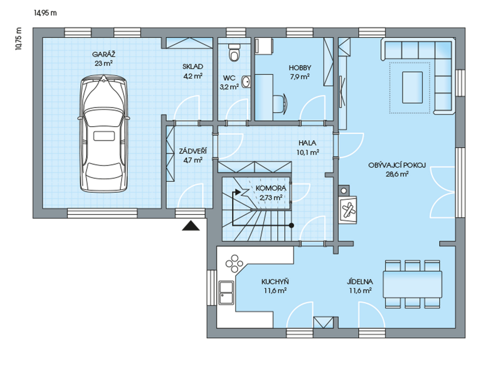 Dům s členitými fasádami, polovalbovou střechou a vikýři se bude hodit do malého města nebo na venkov. Poskytne pohodlné bydlení až šestičlenné rodině. Za pozornost stojí prostorná vstupní hala propojená s velkým obývacím pokojem, v podkroví se nacházejí prostorné ložnice a velká pracovna. Zázemí odpovídá současným nárokům na pohodlné bydlení, včetně garáže integrované v domě. Pokoj v přízemí lze využít k vícegeneračnímu bydlení.