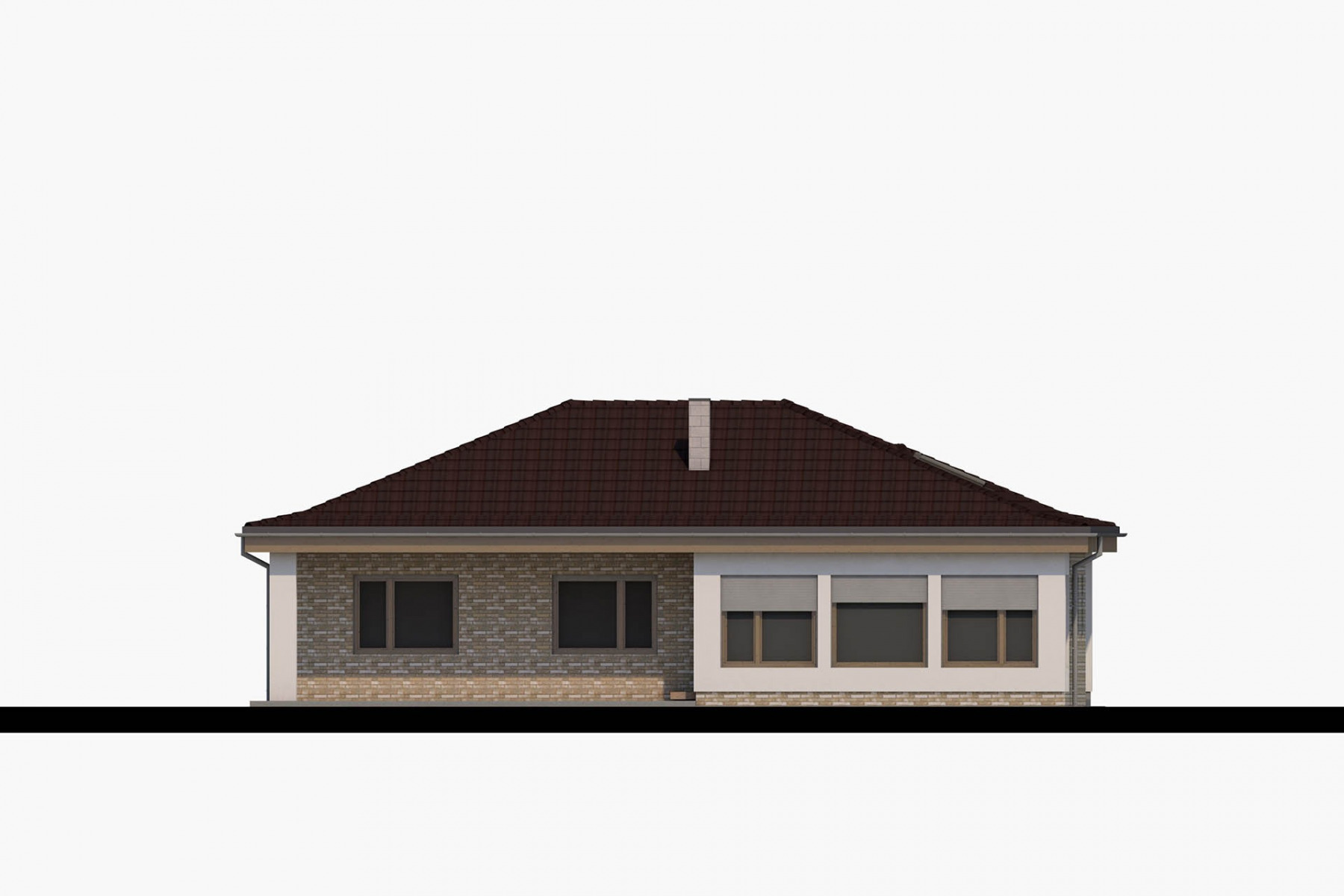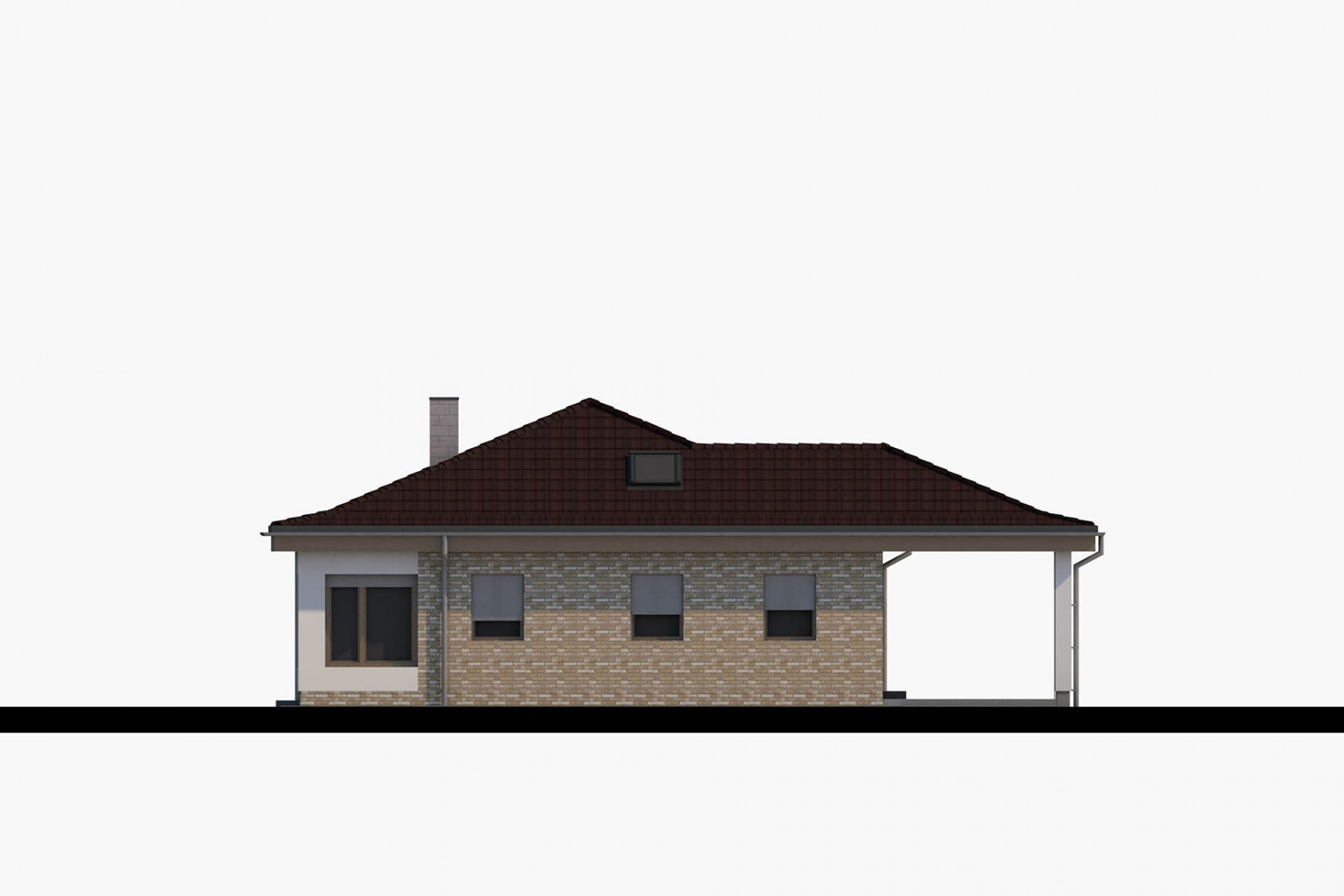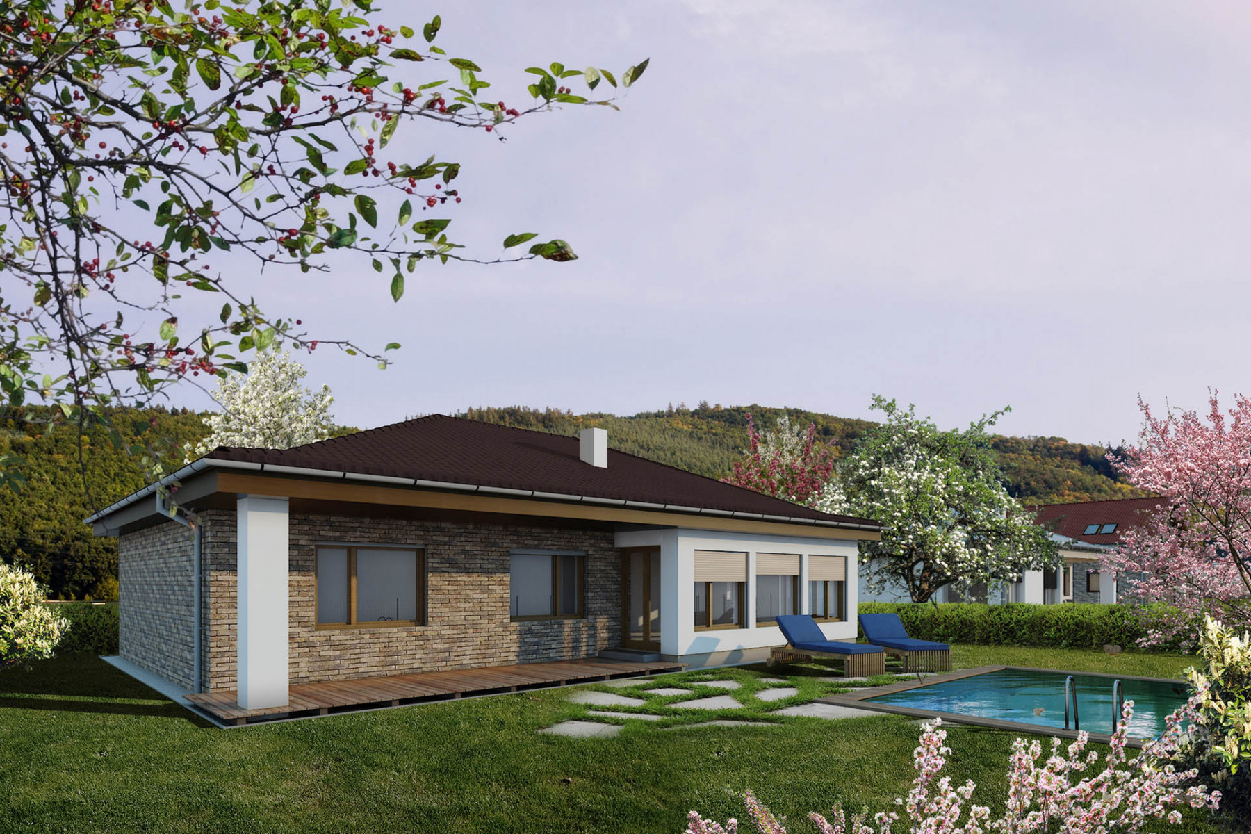 Typový projekt bungalovu o velikosti bytové jednotky 4+kk s krytým garážovým stáním, výstupem z obývacího pokoje na terasu domu a valbovou střechou. Střešní krytina je navržena betonová, není však podmínkou.