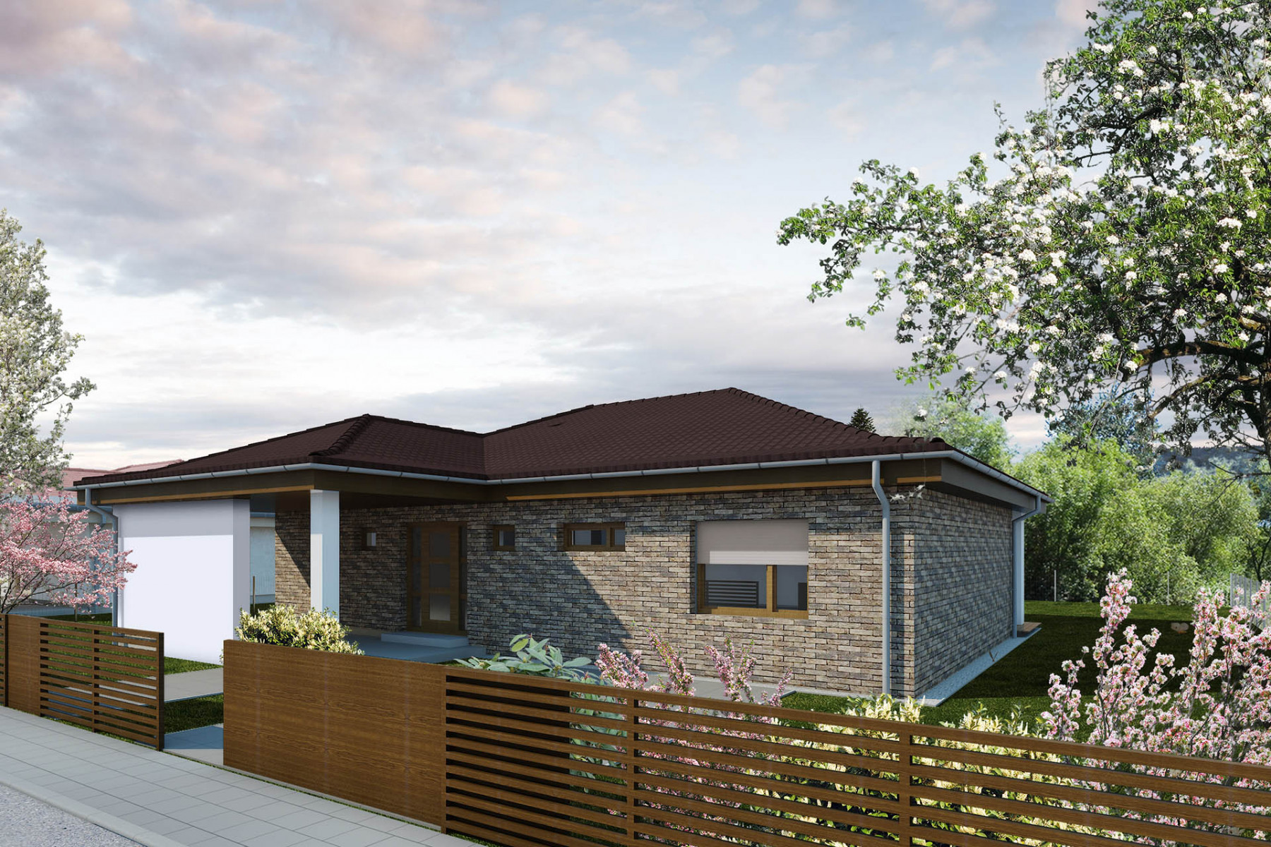 Tato variace na bungalov s valbovou střechou se od běžného standardu odlišuje půdorysem ve tvaru T s krytým garážovým stáním. Uspokojí p... ožadavky čtyřčlenné rodiny na pohodlné bydlení včetně odpovídajícího zázemí. Kromě kryté terasy je třeba zmínit praktickou kuchyň s vlastním vstupem a posuvnými dveřmi do obývacího pokoje a prostornou koupelnu, do níž lze umístit infrasaunu.