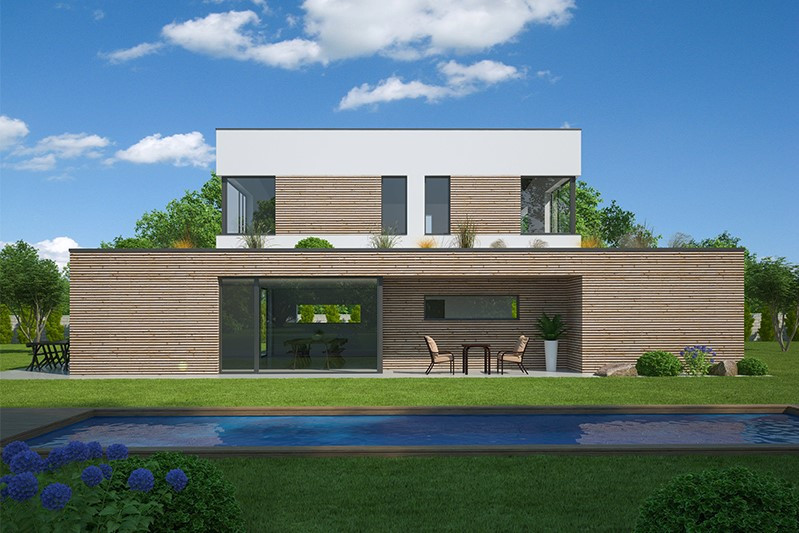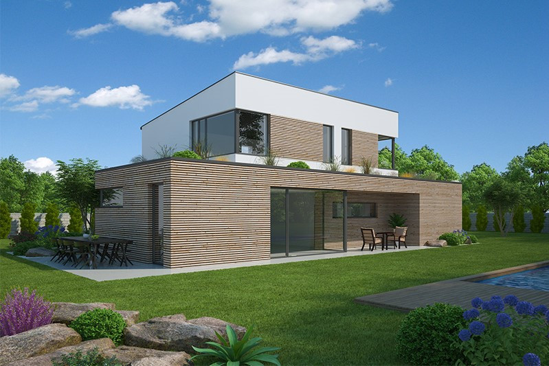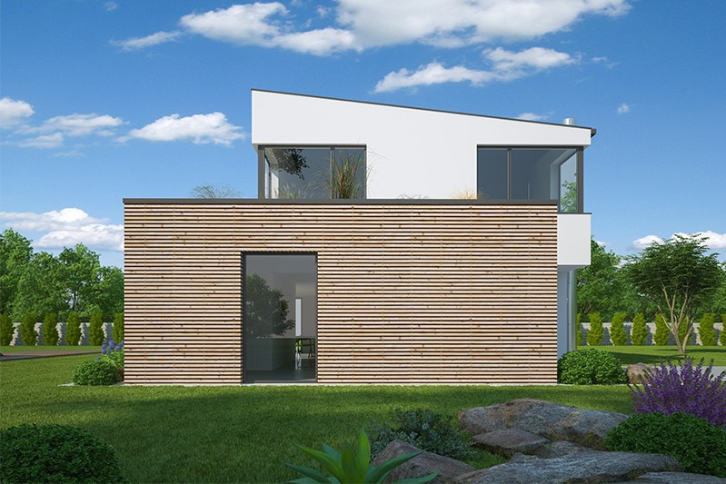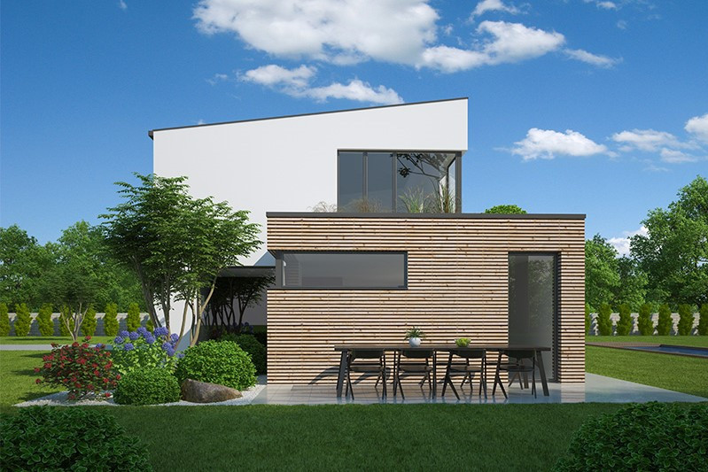 Dům dobře zapadne do města i na venkov a uspokojí nároky na moderní bydlení pro čtyřčlennou rodinu. Velký společný obývací prostor v přízemí je promyšleně rozdělen na kuchyňskou část a sezení, ke kladům patří také chráněná rohová terasa, pohodlné zázemí a dostatek úložného prostoru.