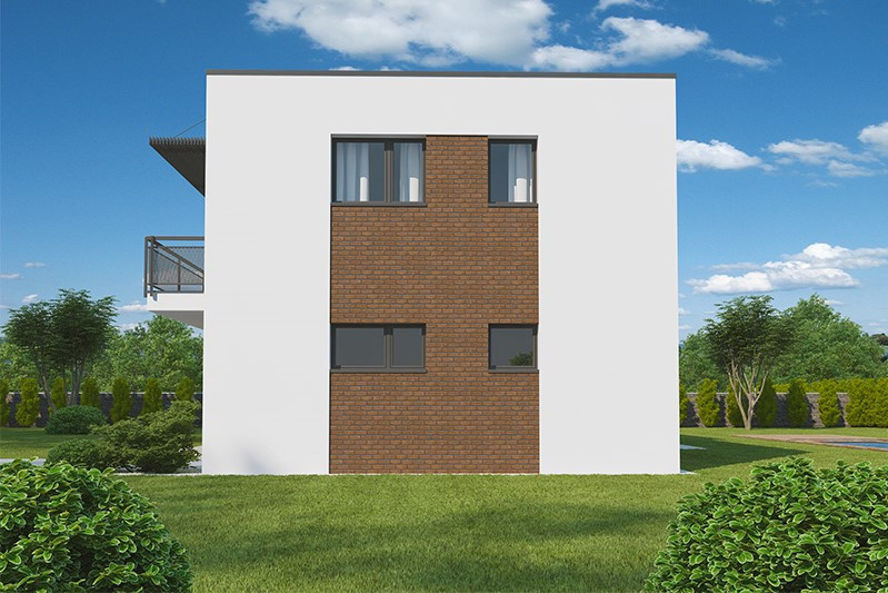 Dům dobře zapadne do města i na venkov a uspokojí nároky na moderní bydlení pro čtyřčlennou rodinu. Velký společný obývací prostor v přízemí je promyšleně rozdělen na kuchyňskou část a sezení, ke kladům patří také chráněná rohová terasa, pohodlné zázemí a dostatek úložného prostoru.