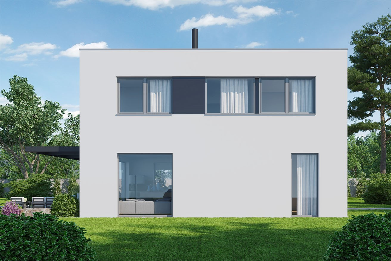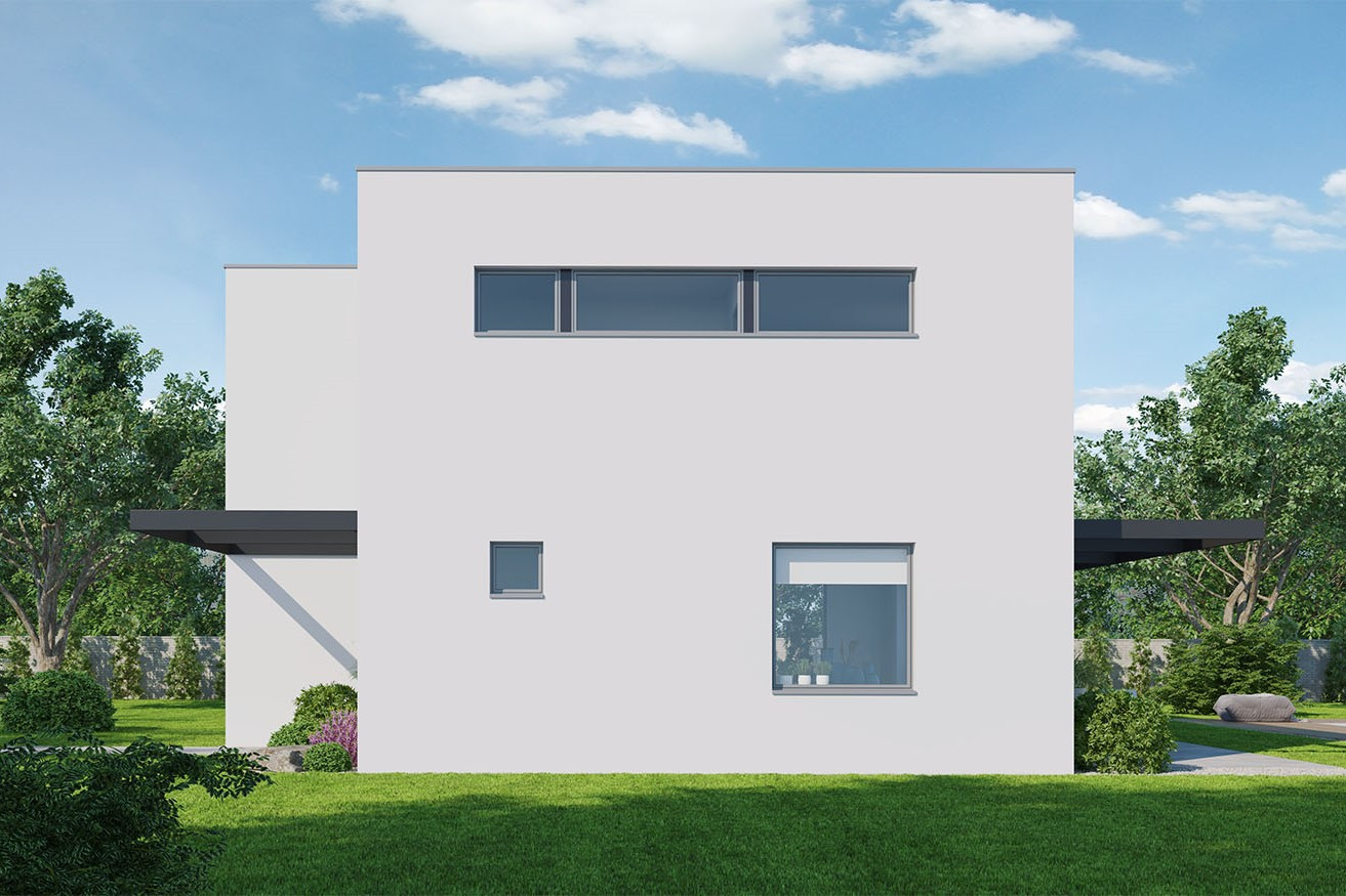 Elegantní moderní dům inspirovaný funkcionalistickou architekturou patří především do nové městské zástavby, nejlépe na pozemek s hezkým... výhledem. I přes nevelkou zastavěnou plochu ukrývá pohodlné bydlení pro čtyřčlennou rodinu s komfortním zázemím. Majitelé domu jistě uvítají rodičovské apartmá s vlastní šatnou a koupelnou. Velké prosklení krásně prosvětlí celý interiér.