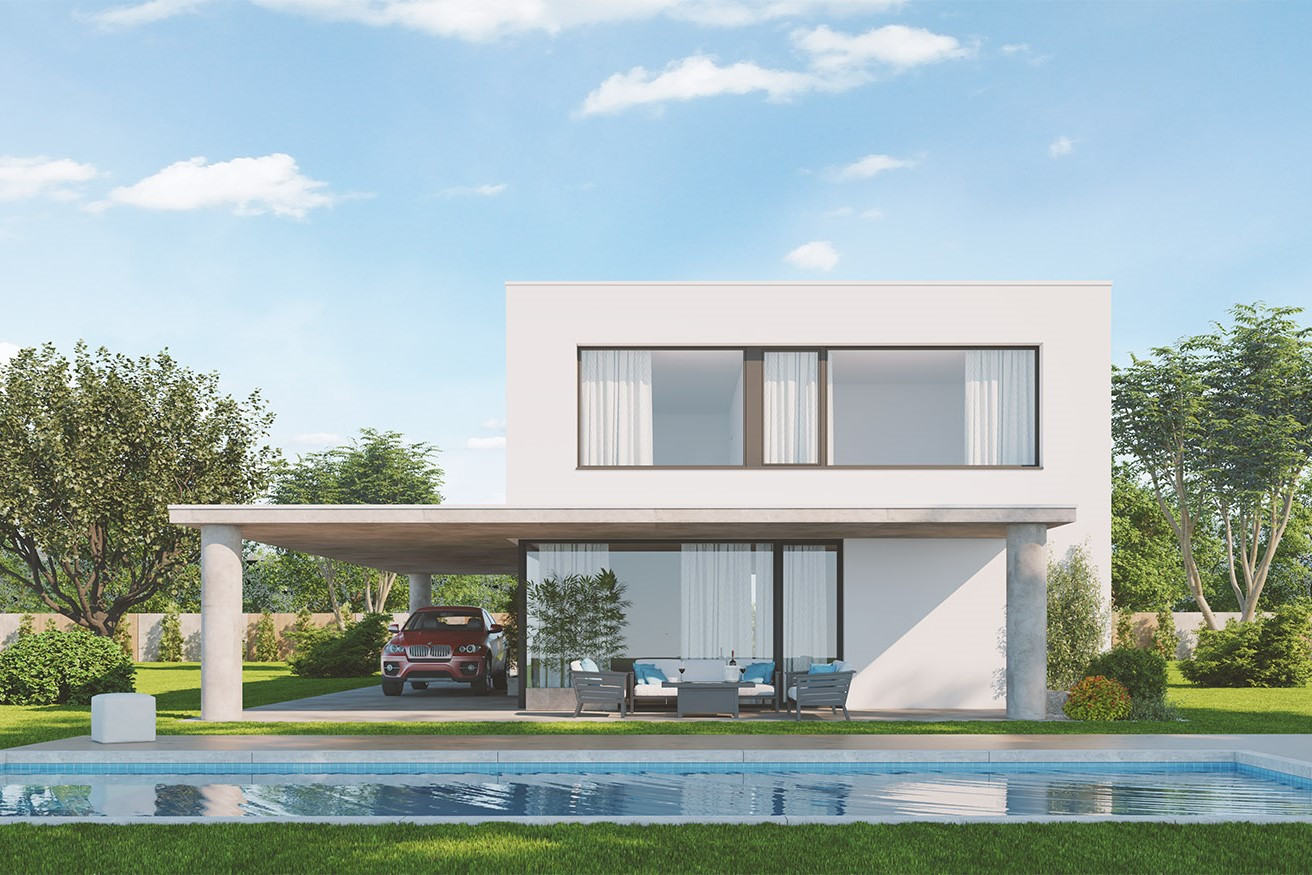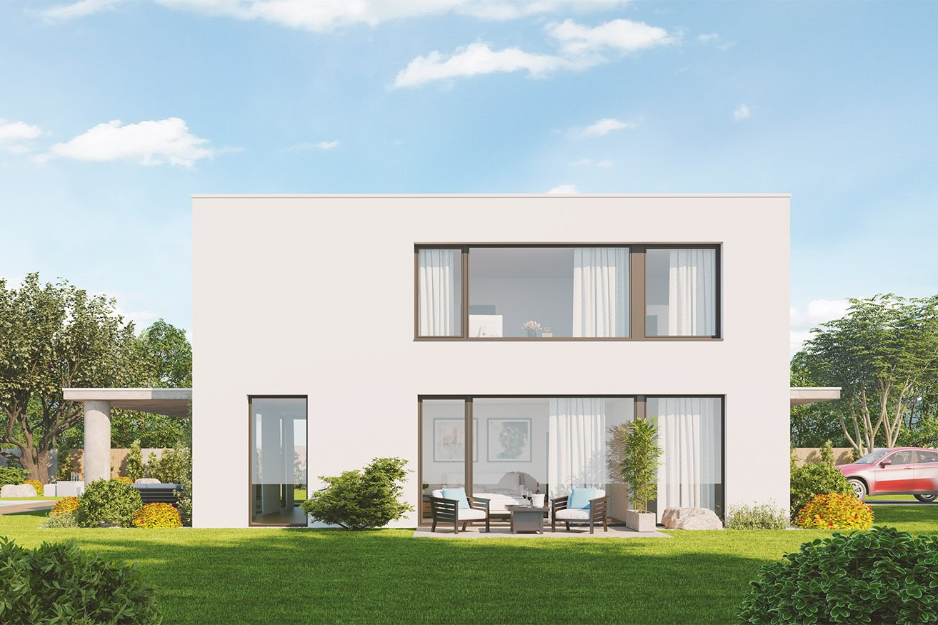 Moderní dům ve tvaru kvádru. Jednoduchá základní hmota šetří prostředky za výstavbu, které lze pak investovat do kryté terasy, lepšího vybavení či více prostoru v pokojích.