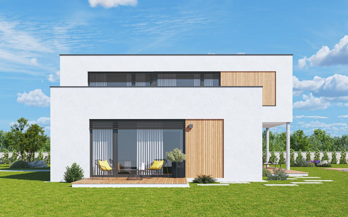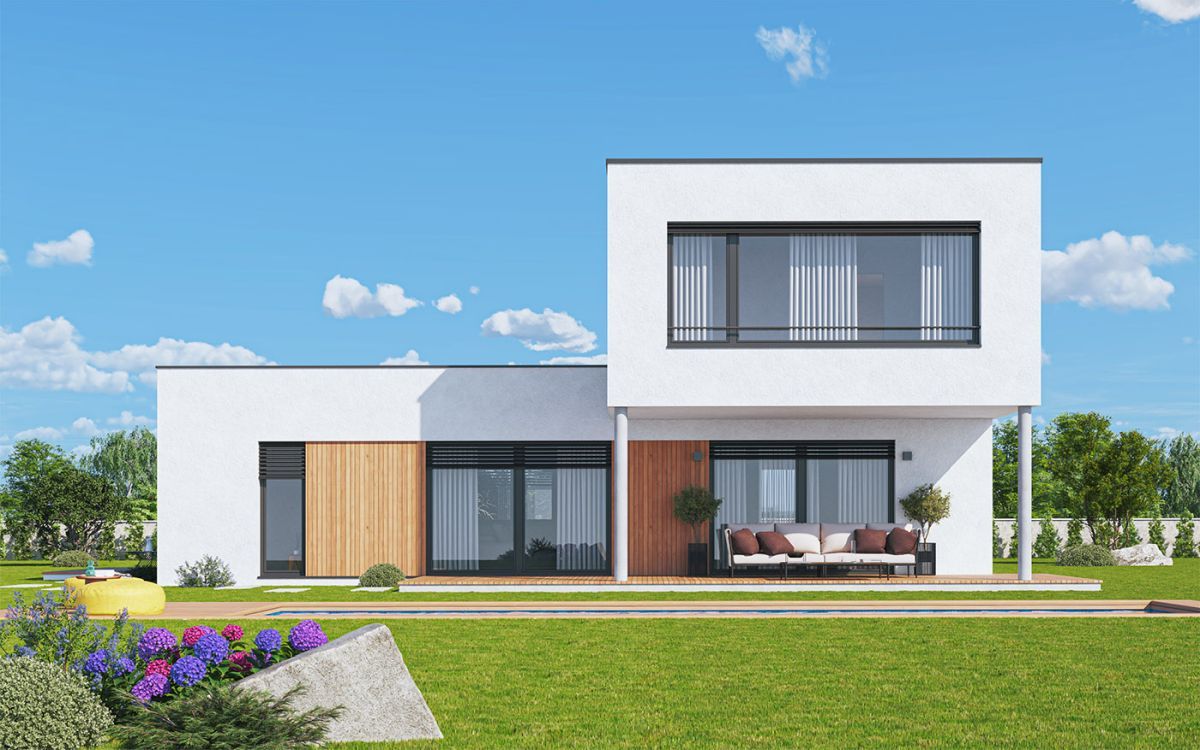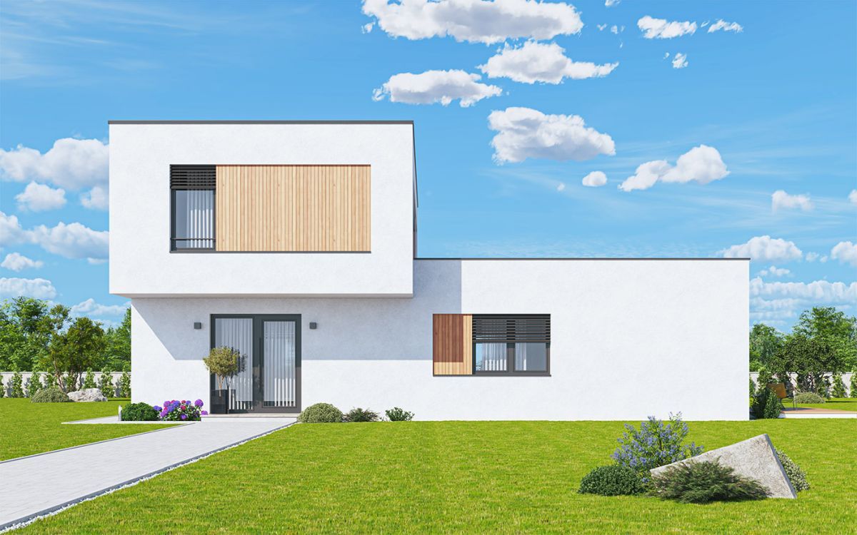 Moderní dům s plochou střechou a půdorysem ve tvaru L odděluje rodičovské apartmá v přízemí od dětských pokojů v patře. Denní část tvoří otevřený obývací prostor s kuchyní a velkými okny do zahrady. Přesah patra vytváří krytý vstup i velkou krytou terasu. Dispozice je světlá, přehledná a připravená na rodinný provoz.