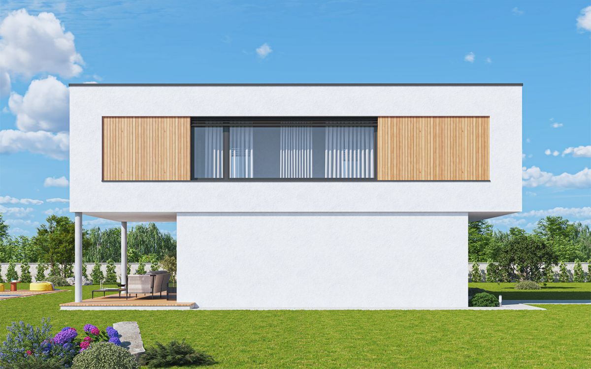 Dům dobře zapadne do města i na venkov a uspokojí nároky na moderní bydlení pro čtyřčlennou rodinu. Velký společný obývací prostor v přízemí je promyšleně rozdělen na kuchyňskou část a sezení, ke kladům patří také chráněná rohová terasa, pohodlné zázemí a dostatek úložného prostoru.