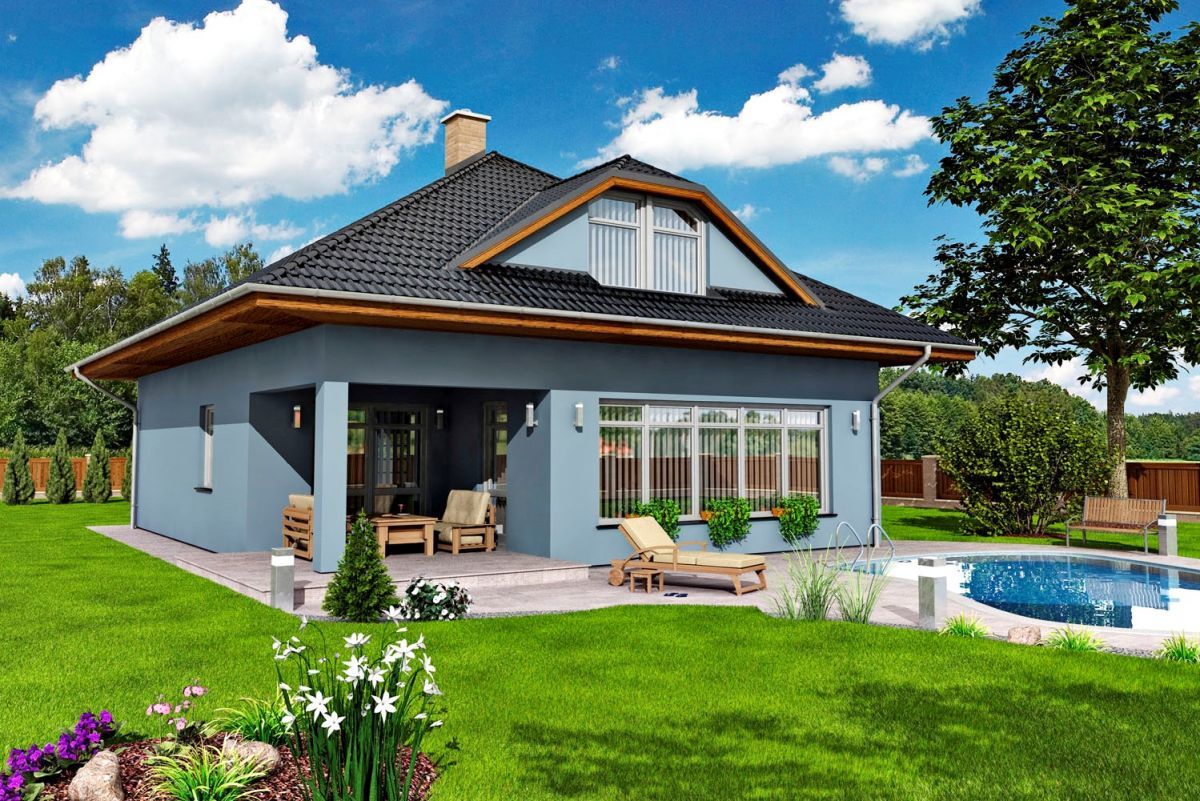 Jedna z mnoha verzí oblíbeného domu na půdorysu písmene L s valbovou střechou a krytou terasou. Nabízí pohodlné soužití tří generací – v přízemí se kromě společného obývacího prostoru nachází velká ložnice s vlastním zázemím, v podkroví jsou pokoje pro rodiče a dvě děti. Projektant pamatoval na pohodlné koupelny a dostatek úložného prostoru. K velkým výhodám domu patří integrovaná dvojgaráž, což je u domů na klíč spíše výjimkou. Za zmínku stojí i prakticky řešená kuchyň s koutem pro domácí práce.