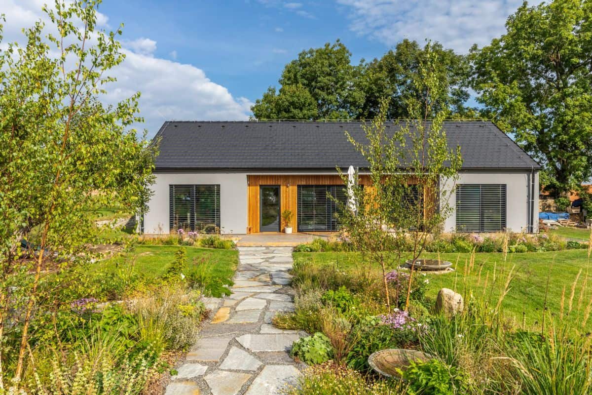Tento dům má po celé jedné straně velká francouzská okna s přímým vstupem na terasu a následně do zahrady. Okna jsou směřována na jih a všechny pokoje v domě tak propojují dům s krásnou zahradou s koupacím jezírkem.