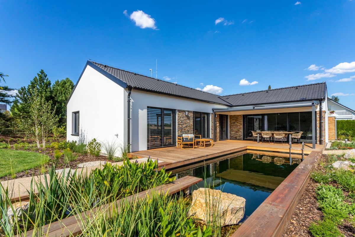 Kombinace sedlové a ploché střechy spojuje tradiční a moderní vzhled a harmonicky zapojuje dům do zástavby na okraji obce. Oblíbená dispozice ve tvaru písmene L je koncipována přehledně a velkoryse – jednu část zaujímá denní zóna, druhou ložnicová část, všechny pokoje mají soukromí a bezbariérový výstup na terasu. Dům poskytuje komfortní zázemí.