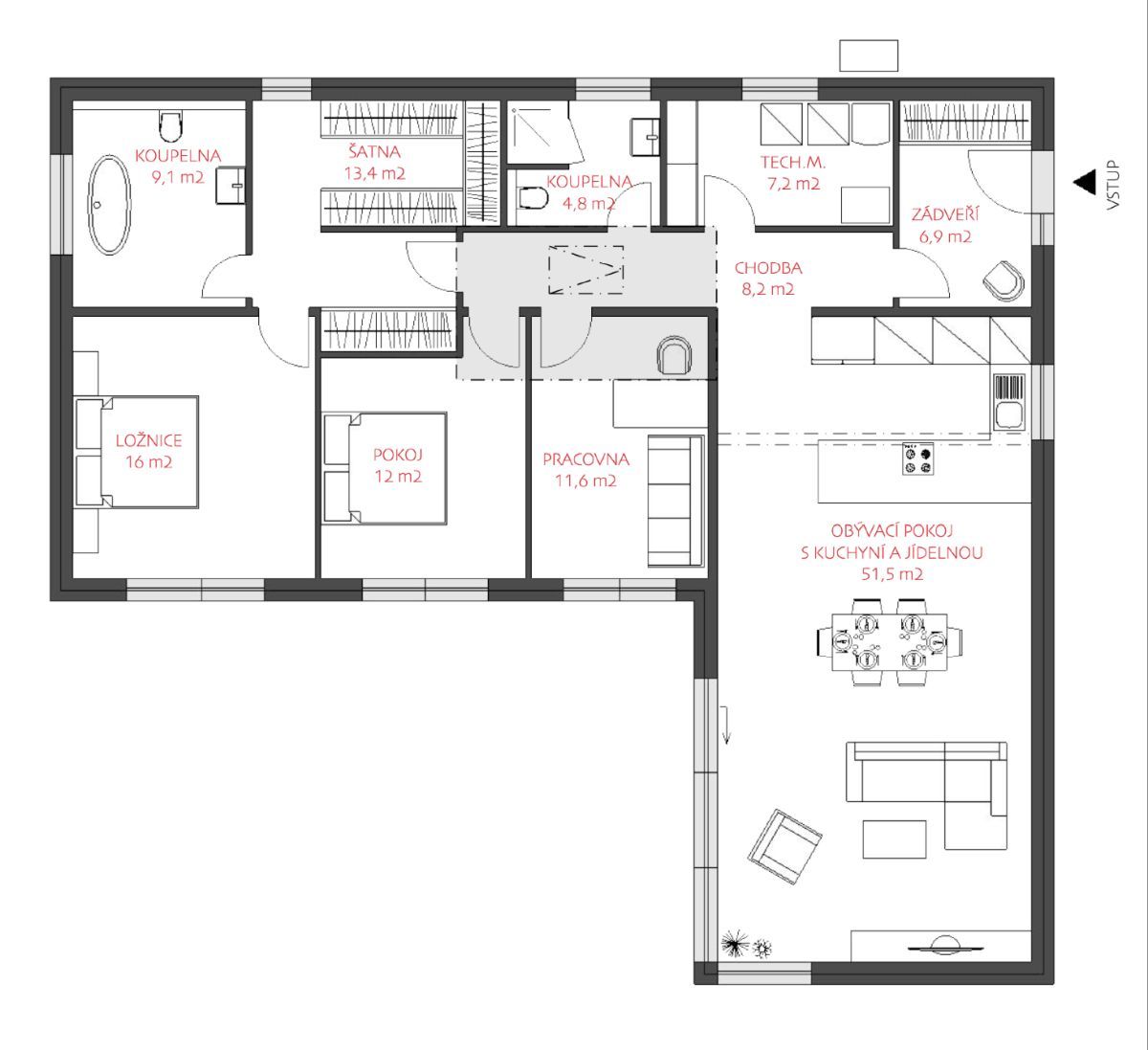 Oblíbená varianta dispozice ve tvaru písmene L je přehledně rozdělena na společnou obývací část a ložnicovou zónu, obytné místnosti mají výstup na terasu s pergolou. Dům poskytuje hodně prostoru i veškeré potřebné zázemí včetně domácí pracovny.