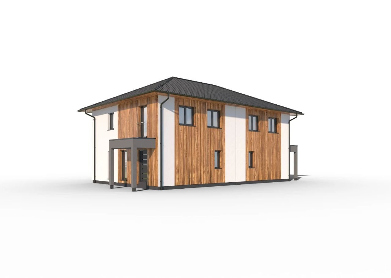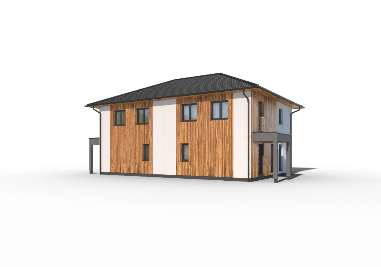 Tato dvoupodlažní vilka se hodí především do městské čtvrti. Je výjimečná tím, že nabízí dvě zcela samostatné bytové jednotky. Výhodou je úspora nákladů na pozemek i samotnou stavbu. Každé podlaží má komfortní dispozici pro čtyřčlennou rodinu s velkým společným obývacím prostorem, krytou terasou a velkými dětskými pokoji. Ve vstupním prostoru je však poměrně málo místa.