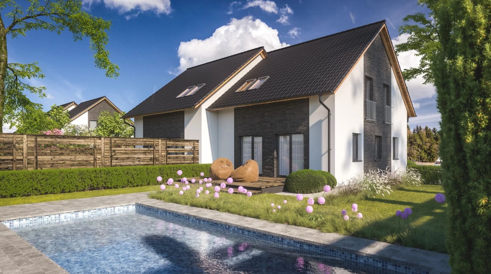 Dvojdům nabízí pohodlné bydlení pro dvě čtyřčlenné rodiny a uspoří stavební náklady i náklady na pozemek. Typově se hodí do městské čtvrti. Promyšlená dispozice je symetrická podle středové dělicí stěny a zaujímá poměrně malou zastavěnou plochu. Každý byt má prostorné zádveří, oblíbený obývací pokoj ve tvaru L, v patře pohodlné ložnice a velkou koupelnu.