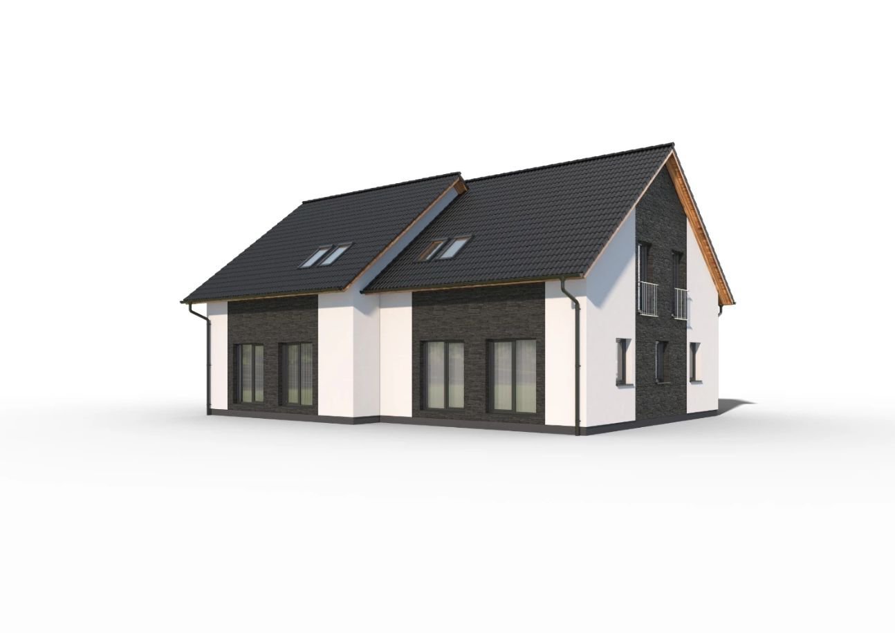 Dvojdům nabízí pohodlné bydlení pro dvě čtyřčlenné rodiny a uspoří stavební náklady i náklady na pozemek. Dispozice jsou symetrick... é podle středové dělicí stěny, obytné místnosti jsou orientovány na opačné strany, takže je zajištěno soukromí a rodiny se navzájem neruší. V přízemí se nachází oblíbený obývací pokoj ve tvaru L s prostornou kuchyní, v podkroví pohodlné ložnice a velkorysá rodinná koupelna.