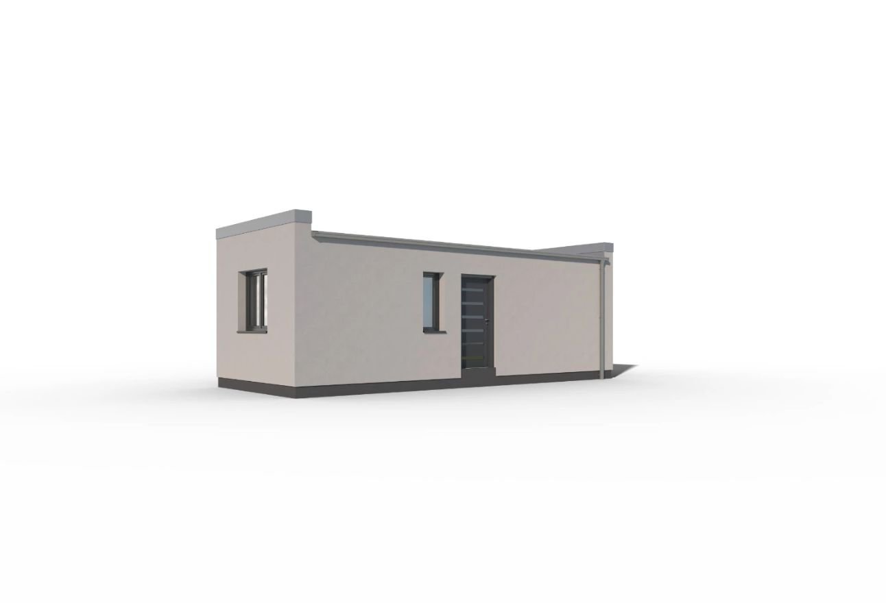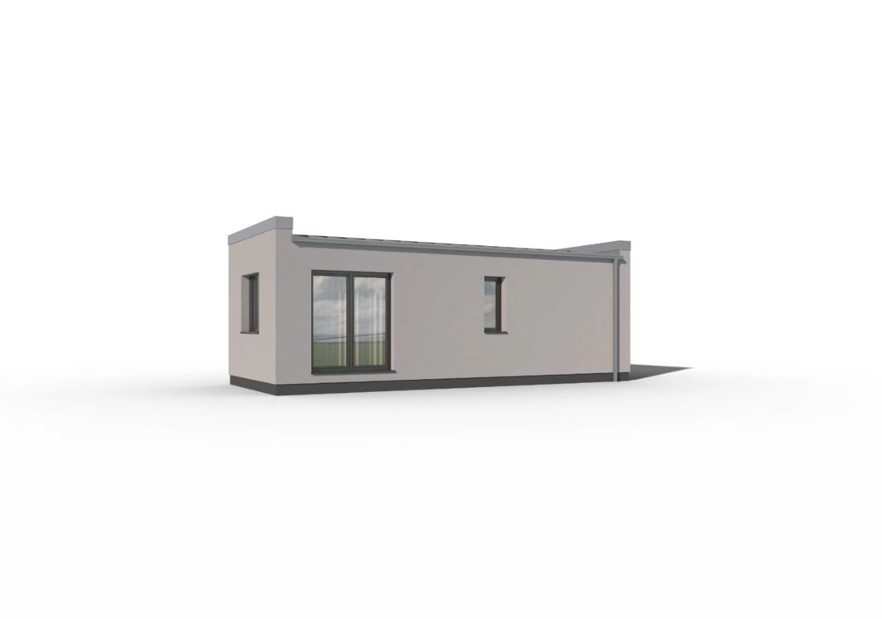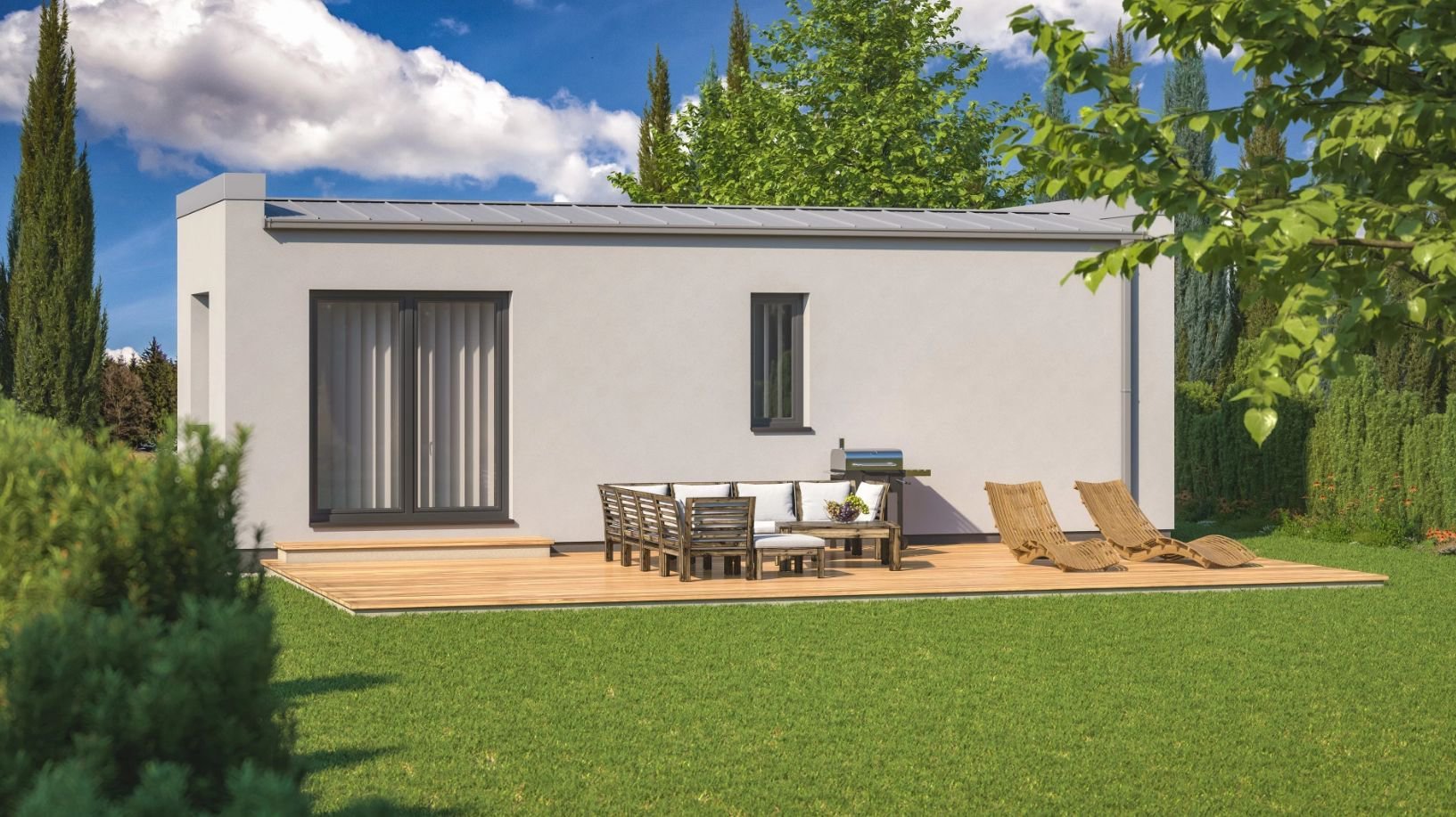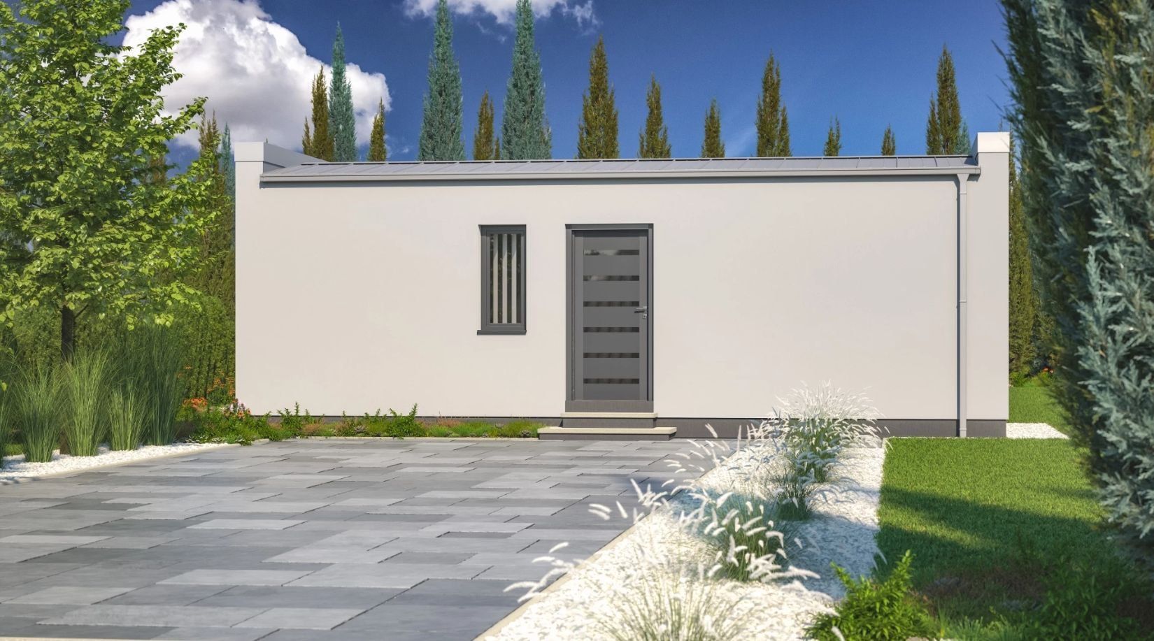Jednoduchý moderní dům bude dobře vypadat v nové i starší zástavbě. Vyžaduje delší obdélníkový nebo velký čtvercový pozemek. Poskytne pohodlné bezbariérové rodinné bydlení, má velký společný obývací prostor, průchozí do ložnicové části. Z každého pokoje se dá vyjít přímo na zahradu. Výhodou je i úsporný provoz.