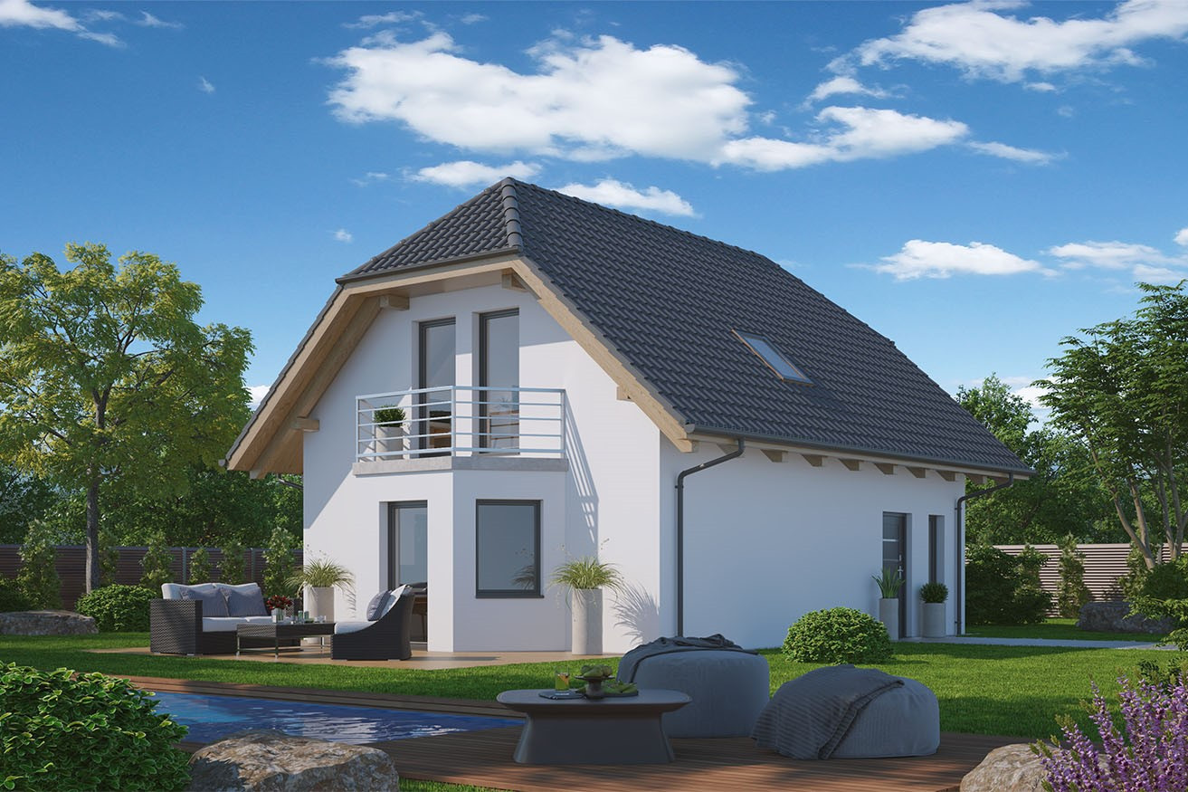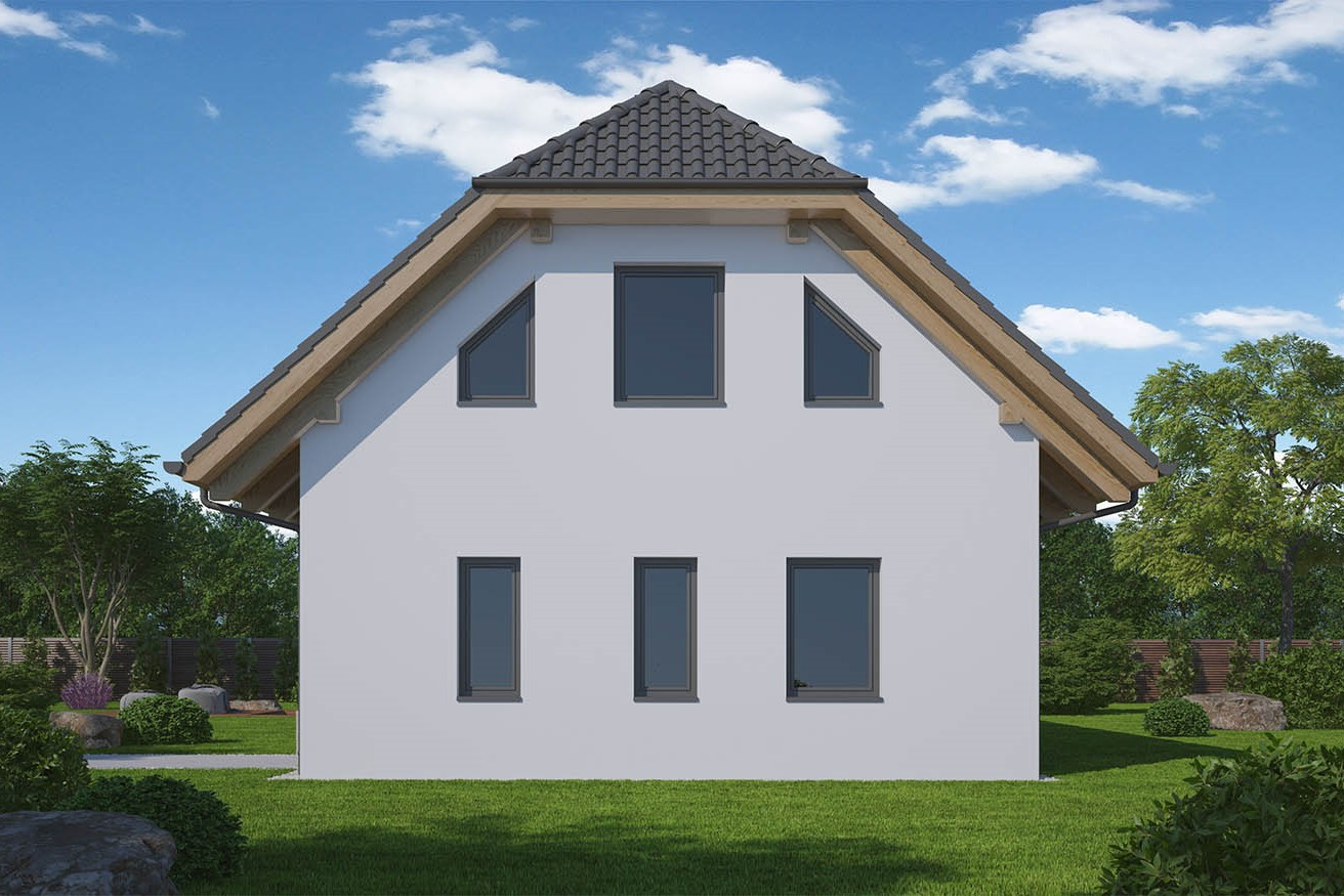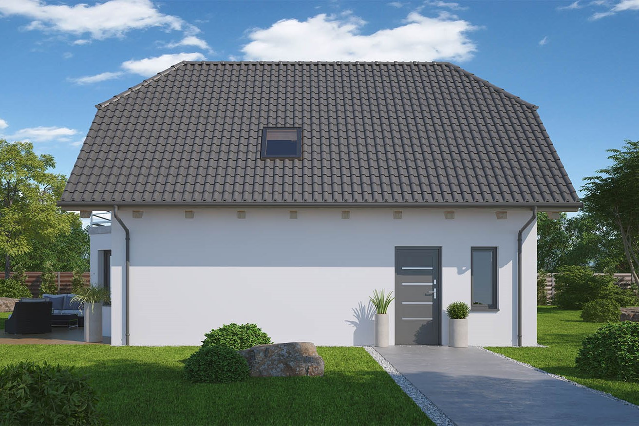 Díky možnosti zvolit různý tvar střechy dům dobře zapadne do městského i venkovského prostředí. Dispozice nabízí nadstandardní komfort pro až pětičlennou rodinu – velké pokoje a pohodlné zázemí včetně potřebného úložného prostoru.