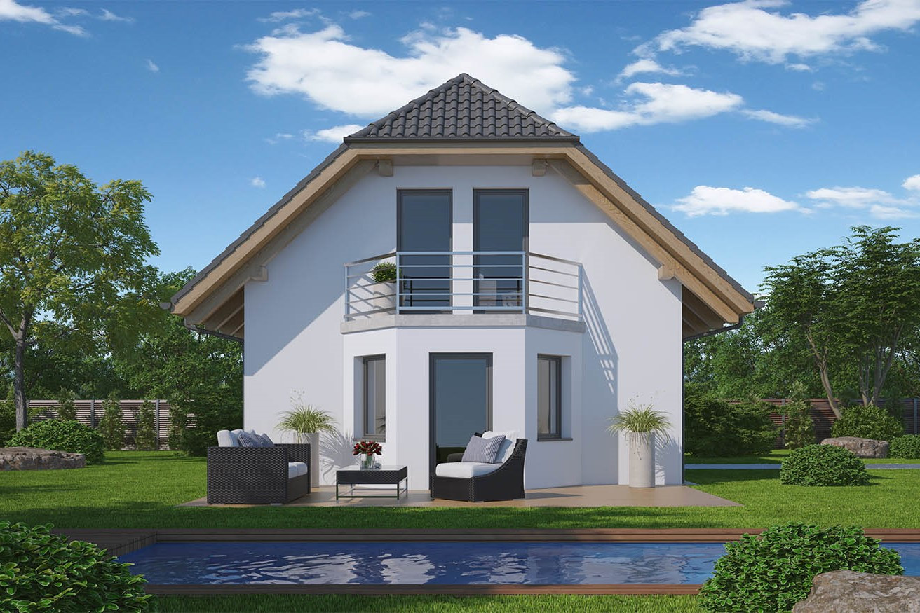 Dům nabízí na malé zastavěné ploše bydlení pro čtyřčlennou rodinu. Vyniká úspornou dispozicí, přesto jsou zde 2 pohodlné koupelny a ša... tna. Má jednoduchý tradiční tvar s polovalbovou střechou a apsidou, hodí se spíše na venkov nebo do starší zástavby.