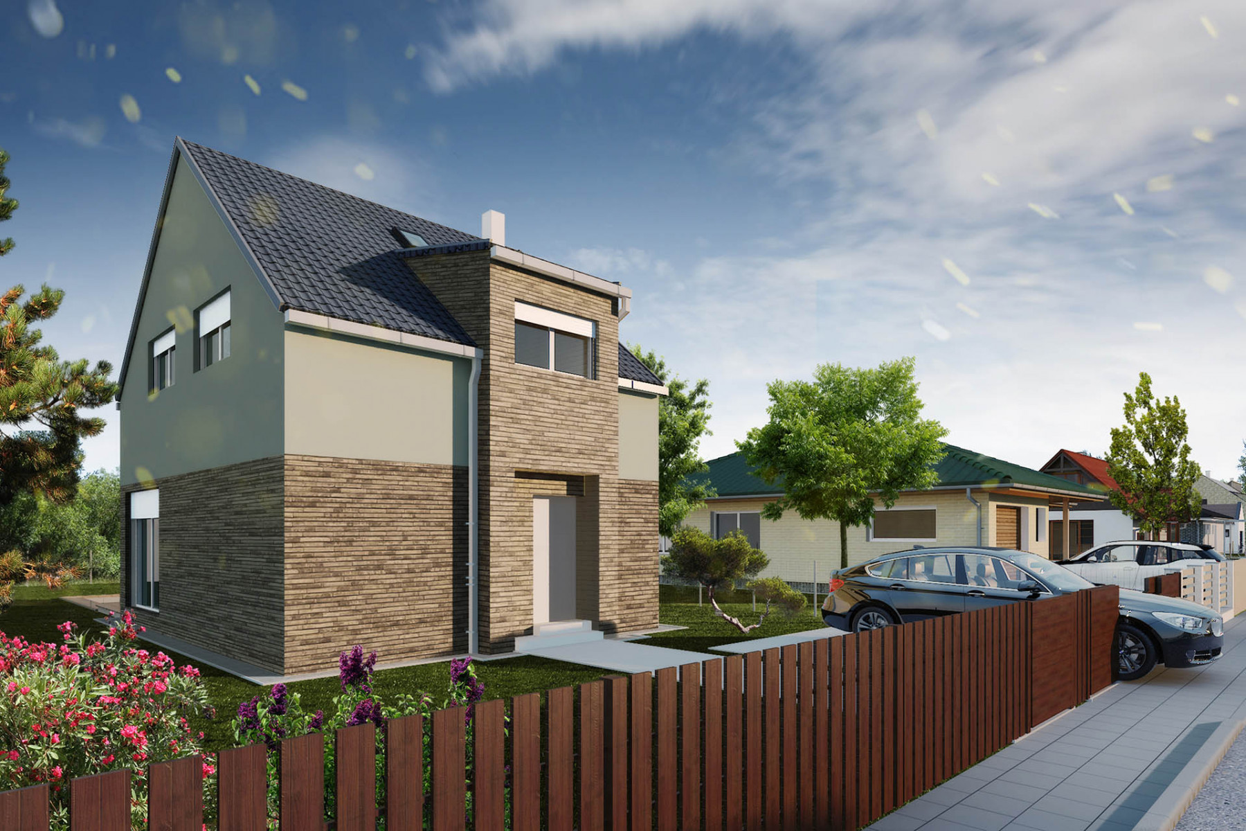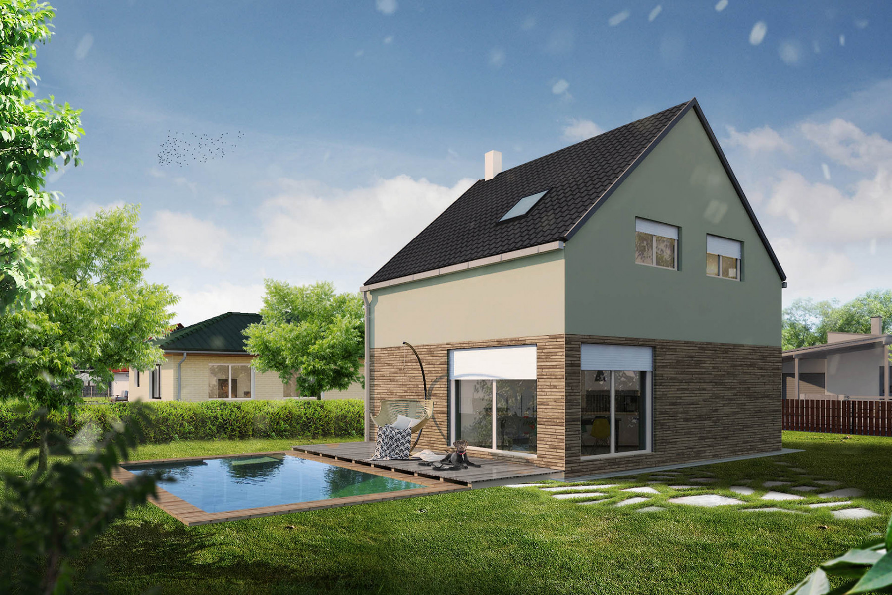 Jedná se o dvoupodlažní dům o dispozici 5 + kk s plochou střechou. Dobře vyřešená dispozice poskytne velkorysý prostor pro rodinné soužití i pro návštěvy a druhé nadzemní podlaží pak poskytuje naprosté soukromí pro každý z pokojů. V druhém nadzemním patře se nacházejí dva pokoje, koupelna a ložnice se svou vlastní koupelnou. Dalším skvělým prvkem je venkovní pergola a kryté parkování pro auta.