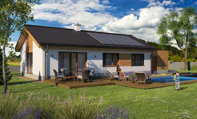 Jednoduchý úsporný dům uspokojí potřeby tříčlenné rodiny nebo bezdětné dvojice. K dispozici je pohodlné zázemí včetně spíže, tech.... místnosti a garáže. Tradiční obdélníková tvar s nízkou sedlovou střechou se hodí na venkov nebo do malého města. K výhodám patří i nízká cena.