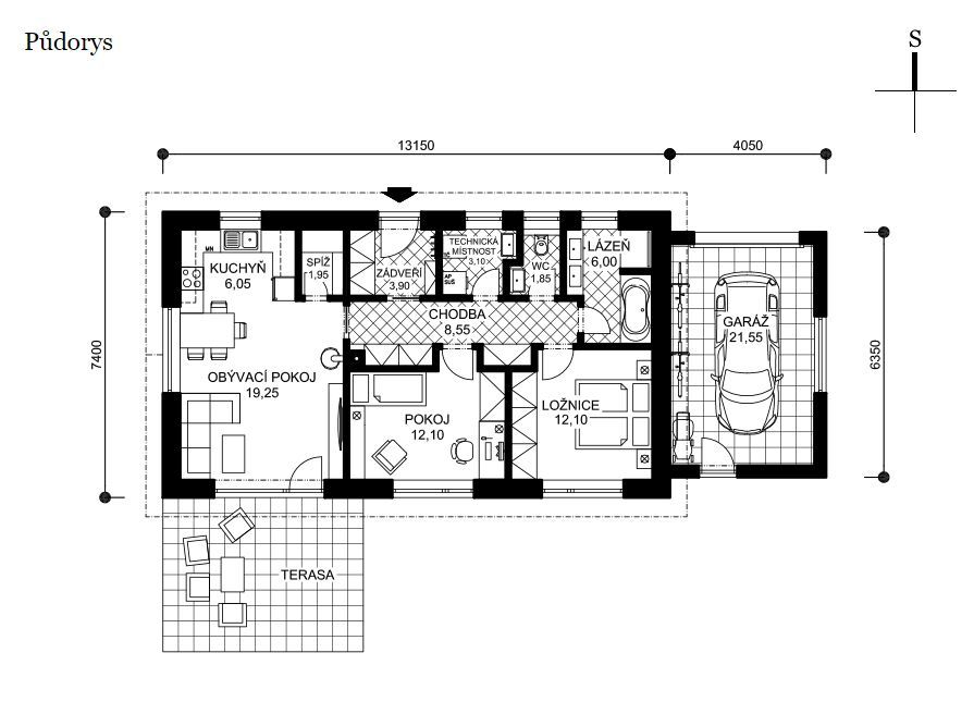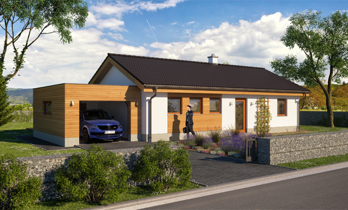 Dispozice domu se hodí jak pro starší klienty, pro které by byl větší obytný prostor již nadbytečný, tak pro mladou rodinu s jedním dítětem. Hlavní část domu je oddělena od garáže vstupním prostorem. Tento je však plně krytý střechou, a vytváří tak dokonalé zázemí pro vstup nejen do domu, ale i do zahrady.