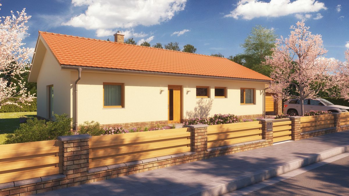 Jedná se o pohodlné bezbariérové bydlení za výhodnou cenu pro čtyřčlennou rodinu. Účelná dispozice umožňuje vytvořit chráněnou rohovou terasu. Ze zádveří se přes chodbu vstupuje přímo do společné obývací části, která je rozdělena na kuchyň s jídelnou a obývací pokoj s výstupem na terasu. Dům je určen pro rovinatý pozemek, doporučuje se, aby hlavní hřeben střechy byl rovnoběžný s osou přístupové komunikace.