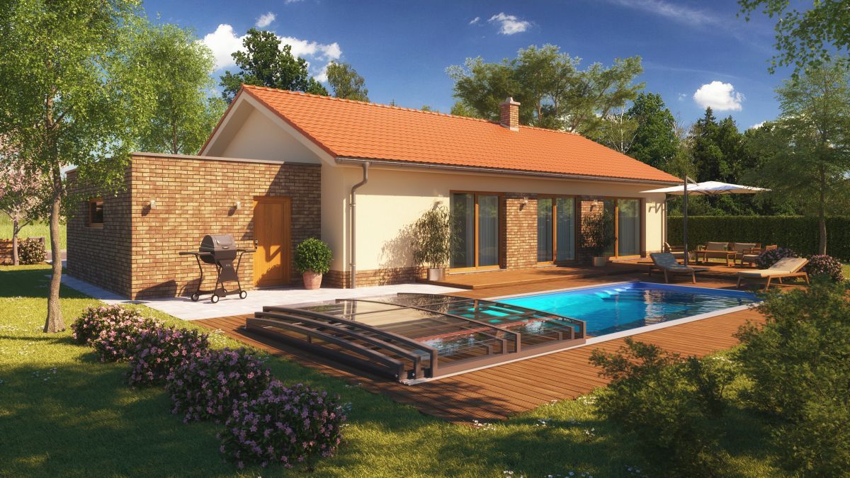 Originální moderní bungalov je vhodný především do nové zástavby a poskytne nadstandardní komfort čtyřčlenné rodině. Architektura zaujme velkým prosklením, zaoblenými nárožími a velkorysým společným obývacím prostorem. Interiér se maximálně propojuje se zahradou, z každého pokoje se dá vyjít přímo ven.