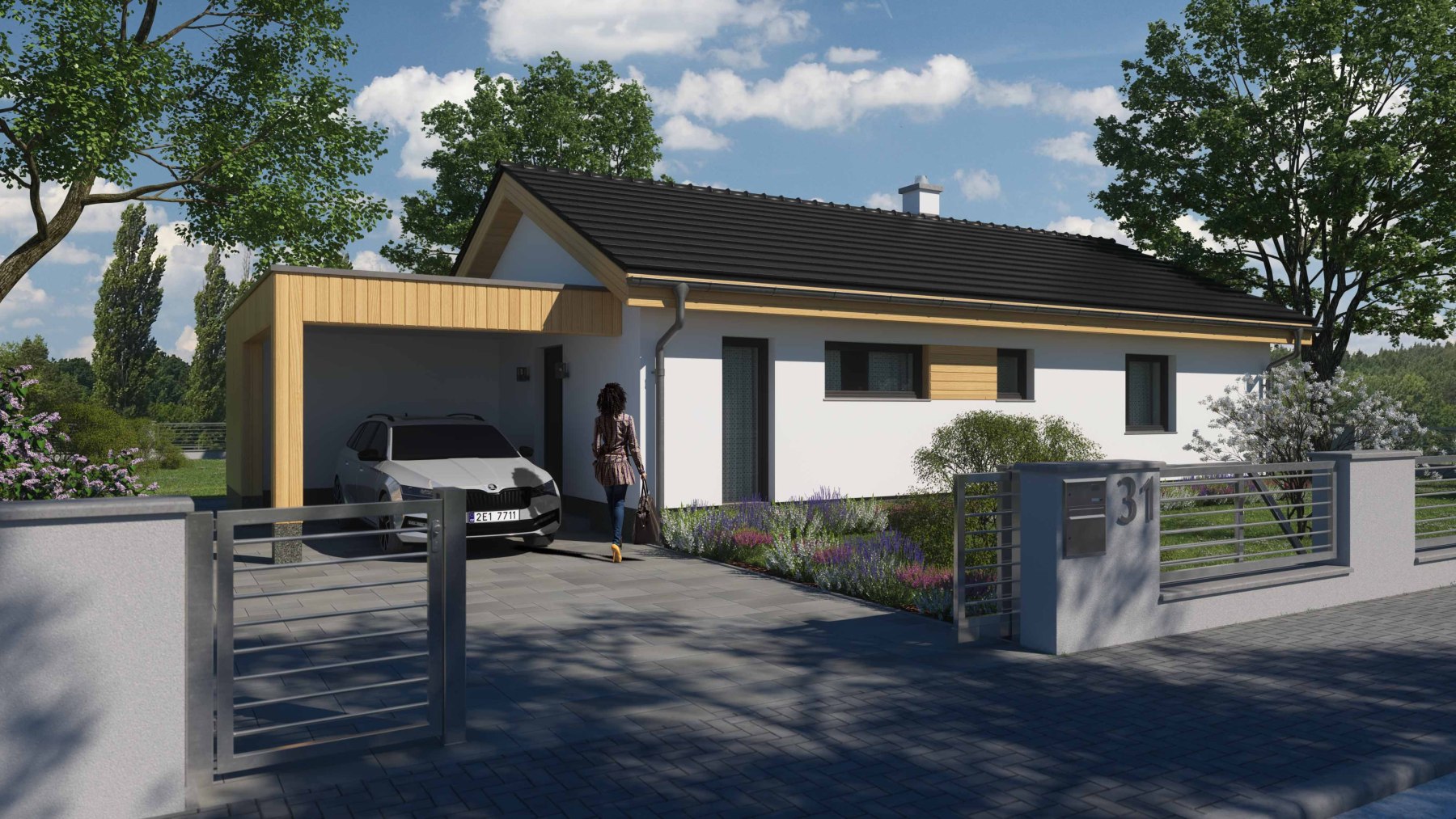 Jednopodlažní dům o dispozici 3 + kk + g je vhodným řešením pro rodiny uvažující o jednom dítěti či jako řešení bydlení na stáří. Dům má půdorys tvaru L, kdy je dispozičně dělen na společenskou a klidovou zónu.