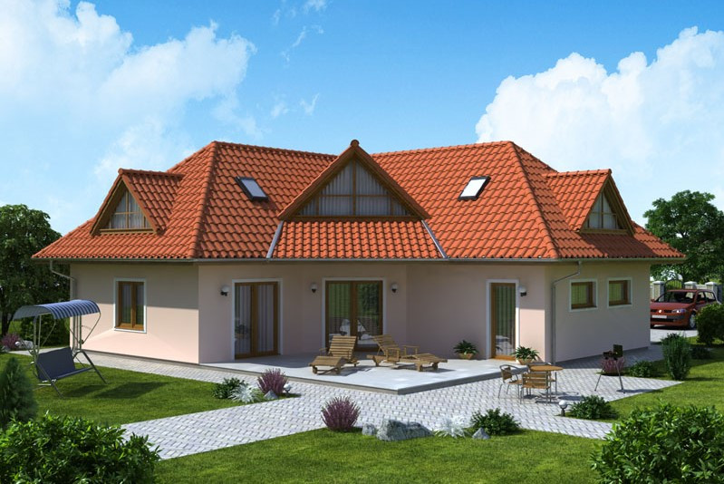 Středně velký dům poskytne pohodlné bydlení pro pětičlennou rodinu. Stavba s tradiční valbovou střechou s vikýři je určena především d... o starší zástavby, malého města nebo do venkovského prostředí. Oblíbená dispozice ve tvaru L vytváří příjemnou chráněnou rohovou terasu propojenou s členitým společným obývacím prostorem. Jako jeden z mála typových projektů zahrnuje Ferdinand 3 integrovanou dvojgaráž. Obyvatelé jistě ocení i domácí pracovnu a prostorné podkroví. Pro pětičlennou rodinu by bylo dobré mít také šatnu a v podkroví samostatné WC.