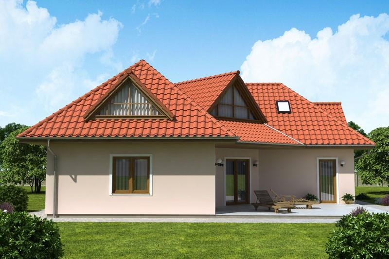 Na chráněné závětří navazuje hala s otevřeným schodištěm do podkroví. Většinu přízemí zaujímá společný obývací pokoj s praktickou dispozicí ve tvaru písmene L a výstupem na terasu. Je tu i pracovna, koupelna a technická místnost průchozí do garáže. V podkroví se nacházejí dva dětské pokoje, ložnice se šatnou, lázeň a WC. Dům je určen pro rovinatý nebo mírně svažitý pozemek, s orientací hřebene střechy kolmo na přístupovou komunikaci.
