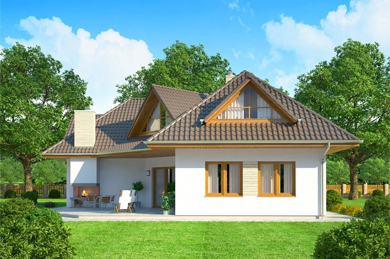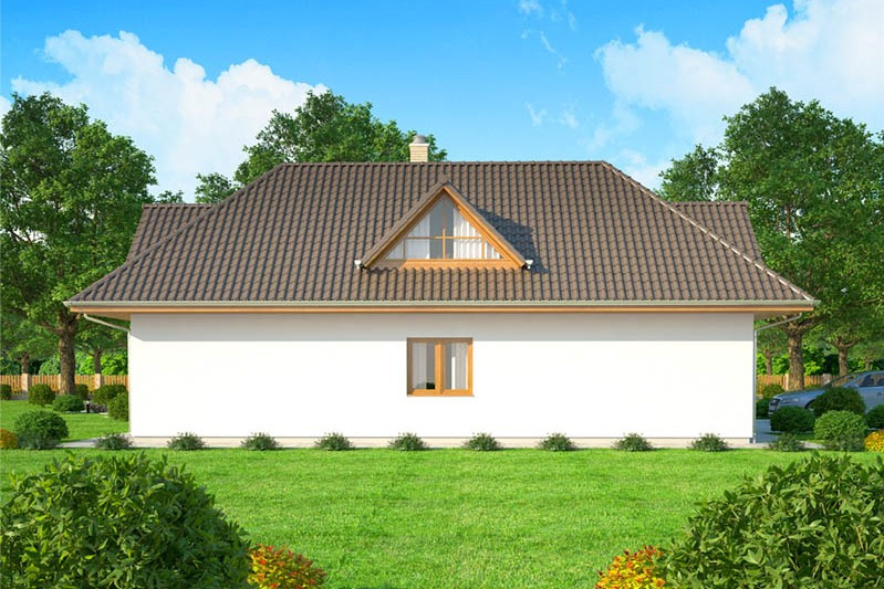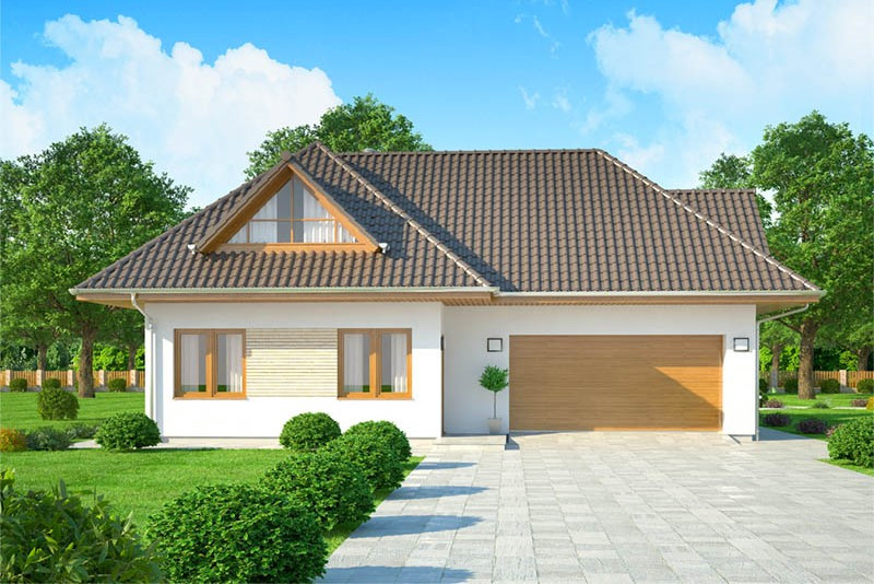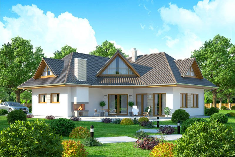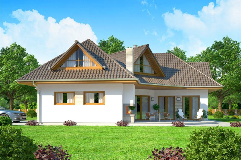 Středně velký dům poskytne pohodlné bydlení pro až šestičlennou rodinu, umožňuje společné bydlení s babičkou nebo dědečkem. Architektu... ra s tradiční valbovou střechou s vikýři se bude hodit zejména do starší zástavby, malého města nebo do venkovského prostředí. Oblíbená dispozice ve tvaru L vytváří příjemnou chráněnou rohovou terasu, propojenou s účelně členěným společným obývacím prostorem. Na rozdíl od běžného standardu má dům samostatnou kuchyň a jako jeden z velmi mála typových projektů i integrovanou dvougaráž. Určitým nadstandardem je i podkroví s velkými pokoji, velkou koupelnou a obytnou halou. Pro velkou rodinu se jedná o cenově výhodné řešení, bylo by však vhodné mít v domě technickou místnost, případně další samostatné WC.