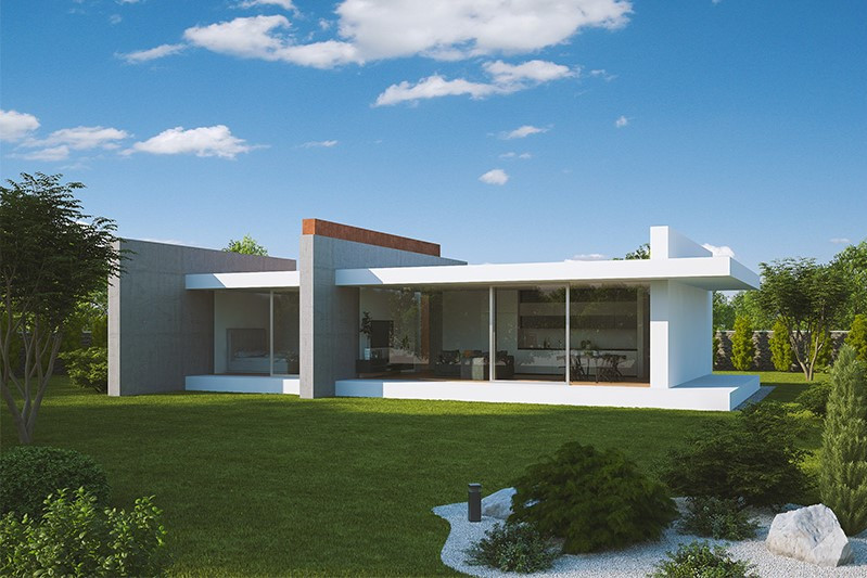 Přízemní dům pro dvojici se vyznačuje výraznou moderní architekturou a vyžaduje velký rovný pozemek, nejlépe v nové zástavbě nebo na okra... ji obce. Komfortní dispozice je přehledně rozdělena na denní a noční část, prosklená stěna interiér bezbariérově propojuje s krytou terasou a zahradou. Největší výhodou domu je přímý kontakt s přírodou, proto se hodí tam, kde je hezký výhled a zároveň vhodná orientace ke světovým stranám. Nadstandardní bydlení se pojí s vyššími investičními náklady.