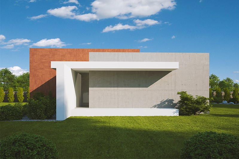 Moderní úsporný dům nabízí praktické bydlení za přijatelnou cenu. Centrem je obývací pokoj s kuchyní a prosklenou stěnou do zahrady. Rozděluje dispozici na dvě části – apartmá rodičů a zónu s dětskými pokoji a hlavním vstupem. Obě zóny mají vlastní zázemí a navzájem se neruší.