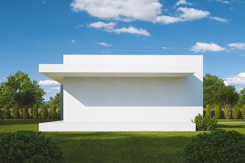Součástí domu je opěrná zeď, tvořící základní prvek celé idey domu. Opěrná zeď, včetně dvojice sloupů, vytváří prostor pro kryté stání dvou automobilů nebo místo pro zastřešené posezení.