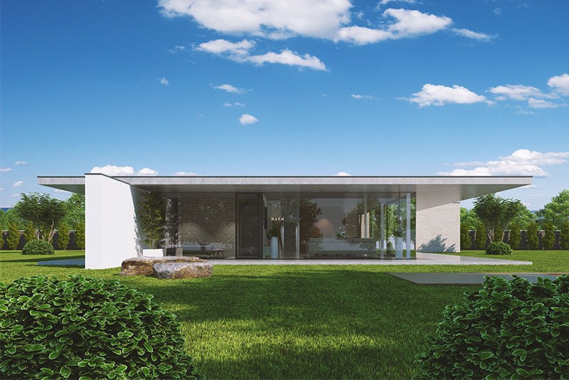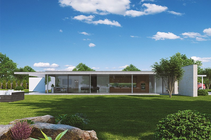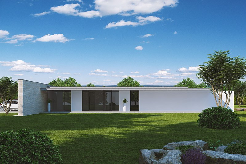 Moderní, ze dvou stran plně prosklený dům je jako stvořený pro velký rovný pozemek v nové čtvrti nebo na okraji obce s výhledem do přírody... . Poskytuje nadstandardní bydlení pro čtyřčlennou rodinu v maximálním kontaktu se zahradou. Interiér je plný světla, z každé místnosti lze vyjít ven na terasu. Komfortní dispozice zahrnuje oddělené ložnice rodičů a dětí, každý má vlastní sociální zázemí, je tu i kryté parkovací stání pro 2 automobily. Je však třeba počítat s vysokou cenou.