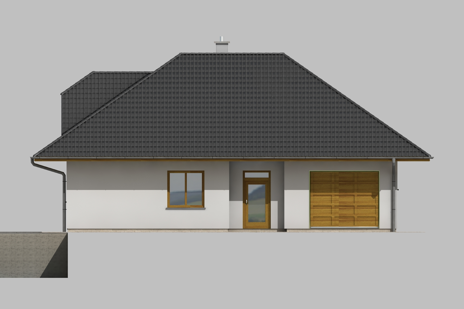 Jedna z mnoha verzí oblíbeného domu na půdorysu písmene L s valbovou střechou a krytou terasou. Nabízí pohodlné soužití tří generací – v přízemí se kromě společného obývacího prostoru nachází velká ložnice s vlastním zázemím, v podkroví jsou pokoje pro rodiče a dvě děti. Projektant pamatoval na pohodlné koupelny a dostatek úložného prostoru. K velkým výhodám domu patří integrovaná dvojgaráž, což je u domů na klíč spíše výjimkou. Za zmínku stojí i prakticky řešená kuchyň s koutem pro domácí práce.
