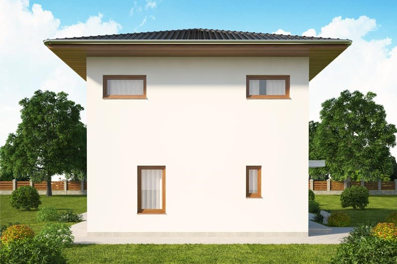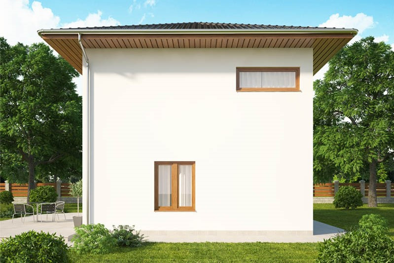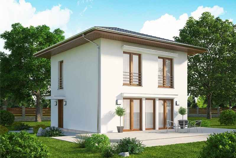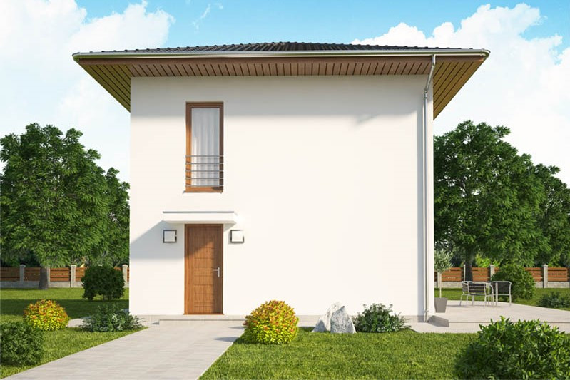 Jednoduchý dvoupodlažní dům symetrického vzhledu je vhodný pro malý rovinatý pozemek, do městského prostředí, do nové i starší zástavby... . Zaujímá minimální zastavěnou plochu a je určen pro tříčlennou rodinu nebo pro dvojici. Dispozice vychází ze standardního rozdělení na společnou obývací část v přízemí a ložnice v patře. Jedná se o úsporné bydlení s nízkými náklady na pozemek, stavbu i provoz.