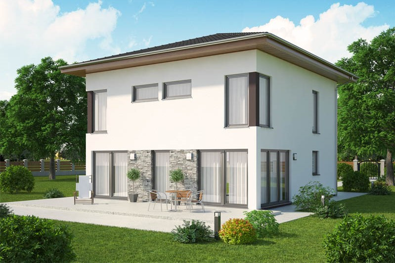 Dům dobře zapadne do města i na venkov a uspokojí nároky na moderní bydlení pro čtyřčlennou rodinu. Velký společný obývací prostor v přízemí je promyšleně rozdělen na kuchyňskou část a sezení, ke kladům patří také chráněná rohová terasa, pohodlné zázemí a dostatek úložného prostoru.