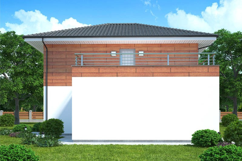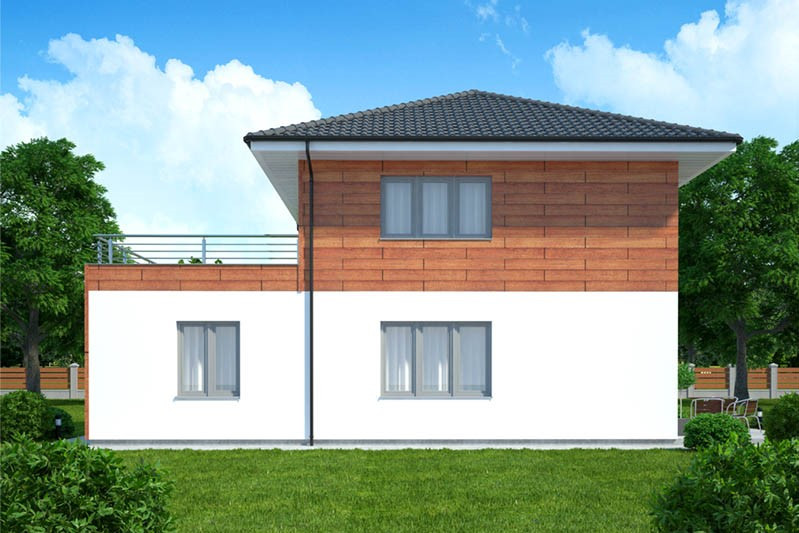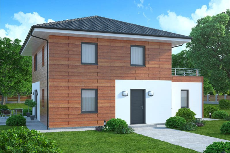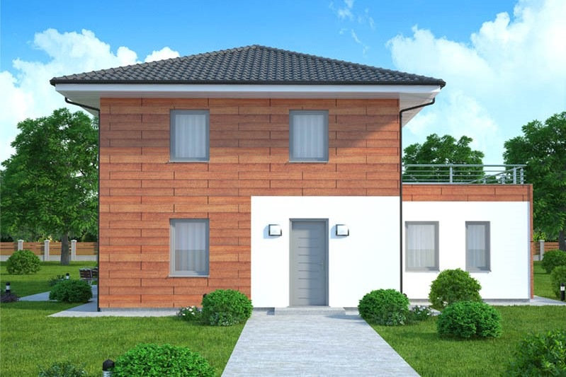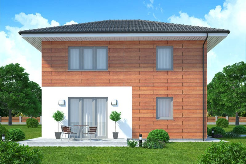 Dům je určen pro rovinatý pozemek, jednoduchá dvoupodlažní stavba se hodí spíše do městského prostředí, do nové i starší zástavby. Obl... ibu si jistě získá fasáda z velké části obložená dřevem. Úsporná dispozice nabízí bydlení pro tří až čtyřčlennou rodinu. V přízemí se nachází společný obývací prostor, ložnice rodičů a pracovna, v patře dětské pokoje, velká střešní terasa a rodinná koupelna. V přízemí není umístěna koupelna ani WC , což je velmi neobvyklé.