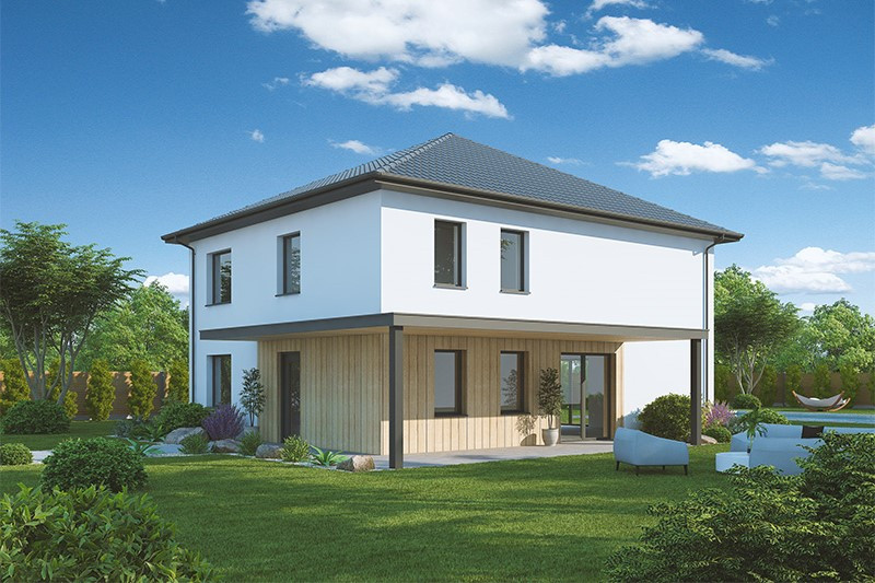Jedná se o dvoupodlažní dům o dispozici 5 + kk s plochou střechou. Dobře vyřešená dispozice poskytne velkorysý prostor pro rodinné soužití i pro návštěvy a druhé nadzemní podlaží pak poskytuje naprosté soukromí pro každý z pokojů. V druhém nadzemním patře se nacházejí dva pokoje, koupelna a ložnice se svou vlastní koupelnou. Dalším skvělým prvkem je venkovní pergola a kryté parkování pro auta.