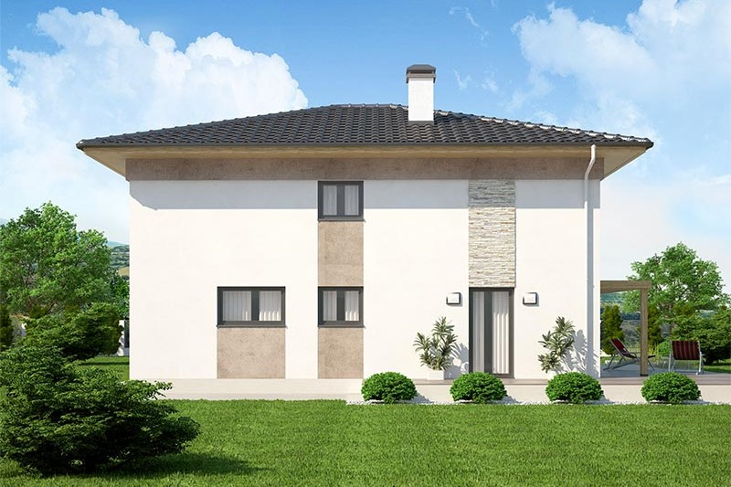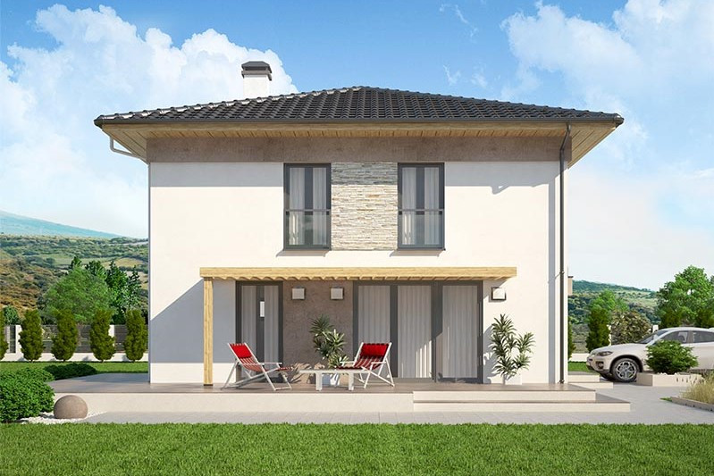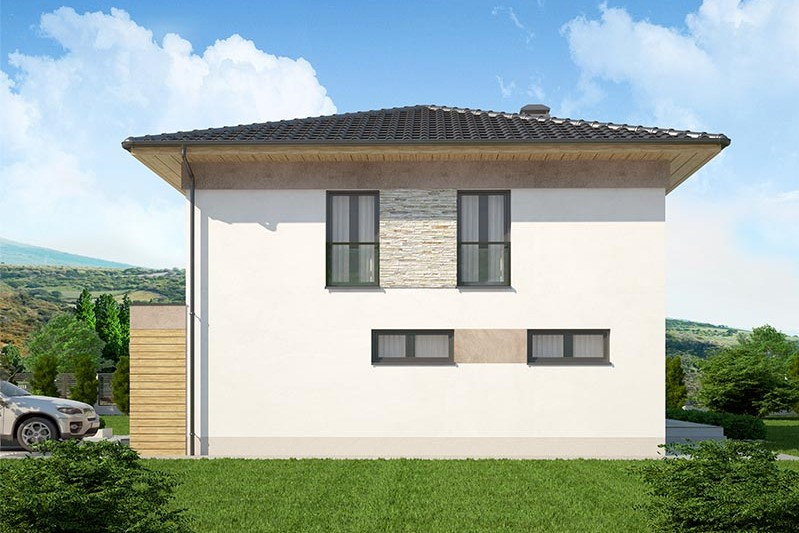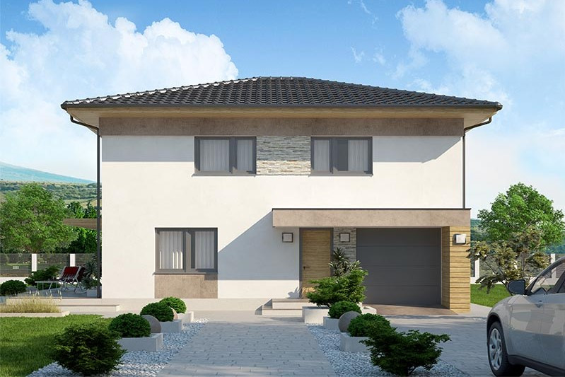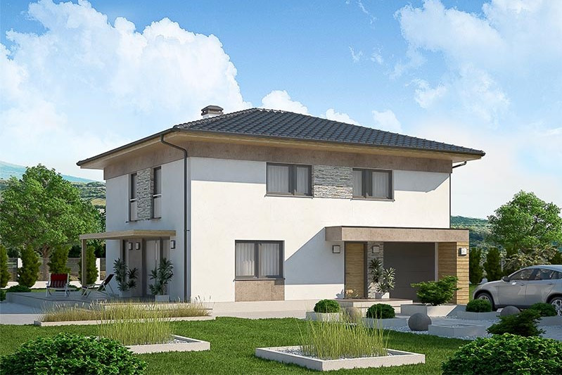 Dům dobře zapadne do města i na venkov a uspokojí nároky na moderní bydlení pro čtyřčlennou rodinu. Velký společný obývací prostor v přízemí je promyšleně rozdělen na kuchyňskou část a sezení, ke kladům patří také chráněná rohová terasa, pohodlné zázemí a dostatek úložného prostoru.