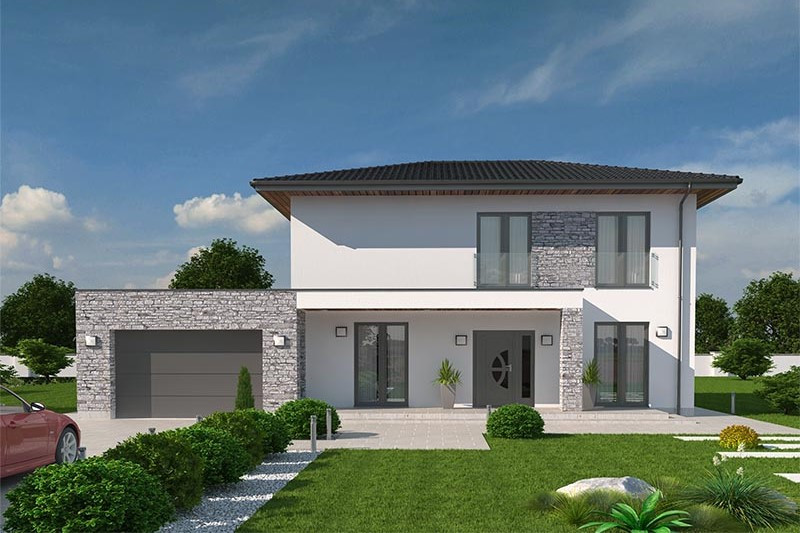 Nadčasový dům pro pohodlné a praktické bydlení. K benefitům patří velký společný obývací prostor přehledně uspořádaný do tvaru L, krytá terasa a hodně úložného prostoru. Jako jeden z mála katalogových domů zahrnuje i garáž pro dva automobily.