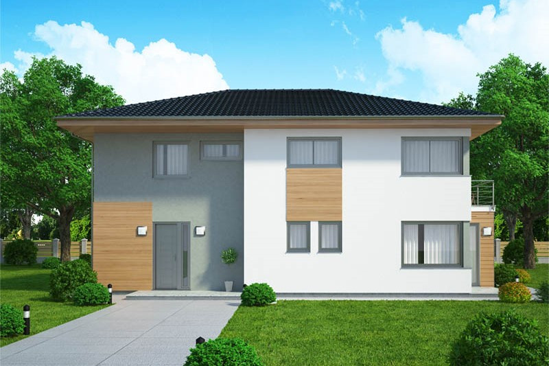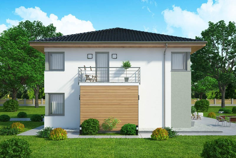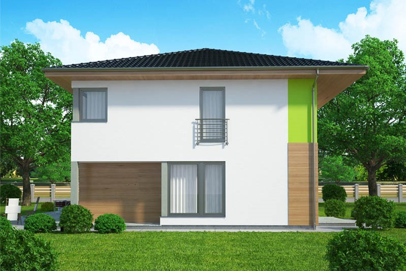 Dům dobře zapadne do města i na venkov a uspokojí nároky na moderní bydlení pro čtyřčlennou rodinu. Velký společný obývací prostor v přízemí je promyšleně rozdělen na kuchyňskou část a sezení, ke kladům patří také chráněná rohová terasa, pohodlné zázemí a dostatek úložného prostoru.