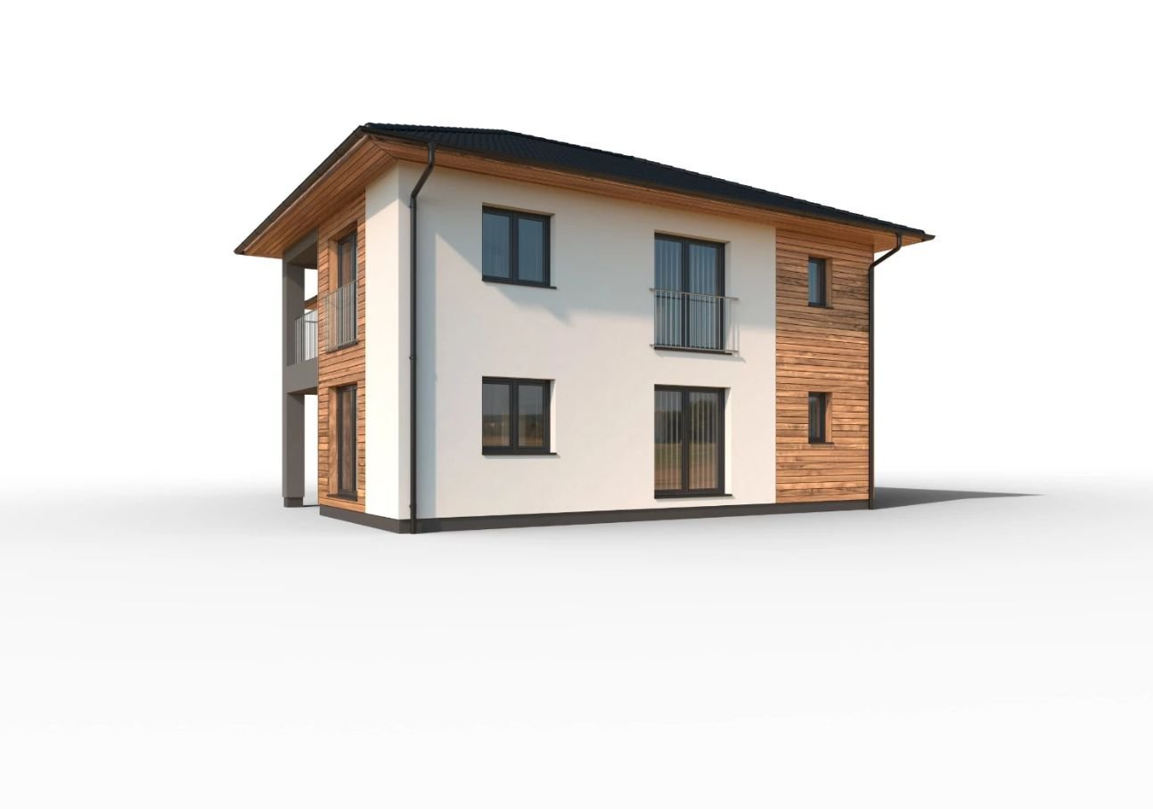 Tato dvoupodlažní vilka se hodí především do městské čtvrti. Je výjimečná tím, že nabízí dvě zcela samostatné bytové jednotky.... Výhodou je úspora nákladů na pozemek i samotnou stavbu. Každé podlaží má komfortní dispozici pro čtyřčlennou rodinu s velkým společným obývacím prostorem, krytou terasou a velkými dětskými pokoji. Ve vstupním prostoru je však poměrně málo místa.