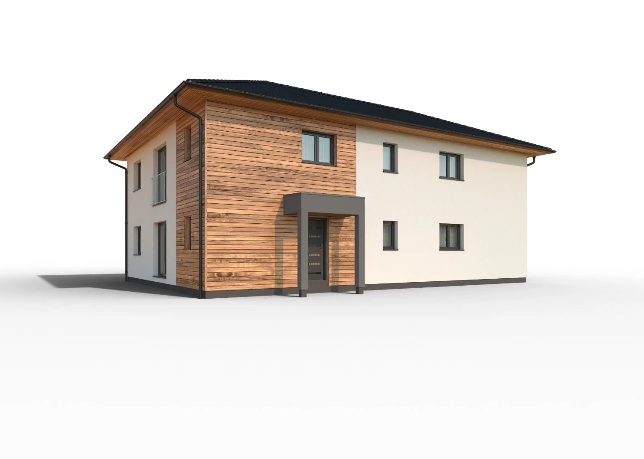 Dvojdům nabízí pohodlné bydlení pro dvě čtyřčlenné rodiny a uspoří stavební náklady i náklady na pozemek. Typově se hodí do městské čtvrti. Promyšlená dispozice je symetrická podle středové dělicí stěny a zaujímá poměrně malou zastavěnou plochu. Každý byt má prostorné zádveří, oblíbený obývací pokoj ve tvaru L, v patře pohodlné ložnice a velkou koupelnu.