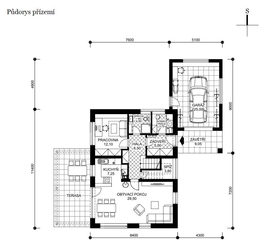 Najdete tu vše, co by v domě pro pětičlennou rodinu mělo být – v přízemí je společná obývací část propojená se zahradou, v podkroví tři dětské pokoje a ložnice rodičů. Všude dostatek úložného prostoru, výhodou je garáž propojená se zádveřím a také domácí pracovna.