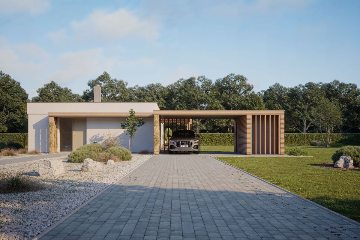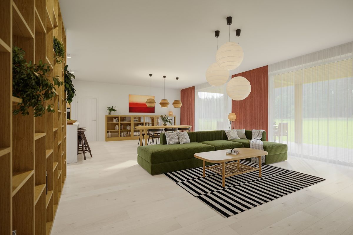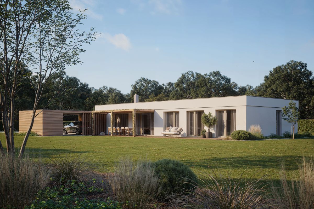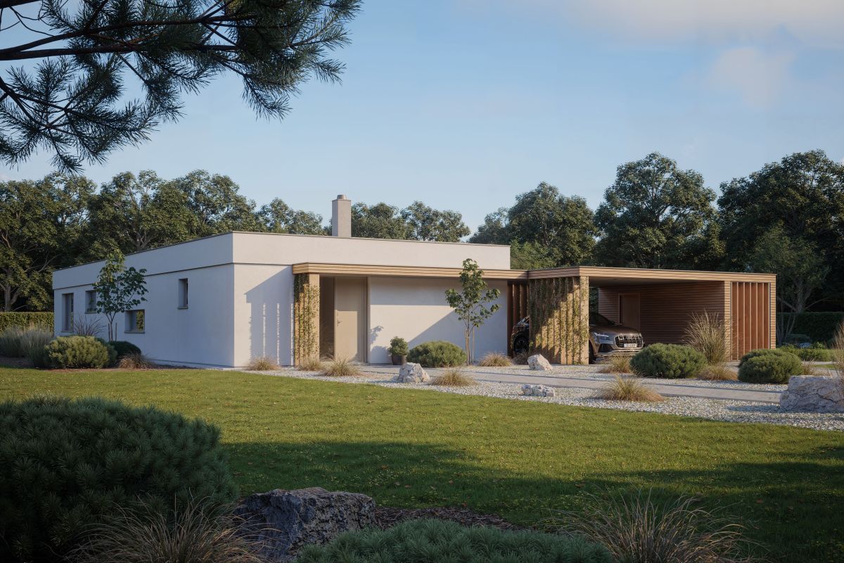 Bungalov obdélníkového tvaru s plochou střechou snoubí všechny základní elementy moderního bydlení. Dispozice zahrnuje velký společný obývací prostor, dva dětské pokoje a ložnici rodičů, pracovnu, která může sloužit jako další dětský pokoj, dvě koupelny, spíž, dvě šatny.